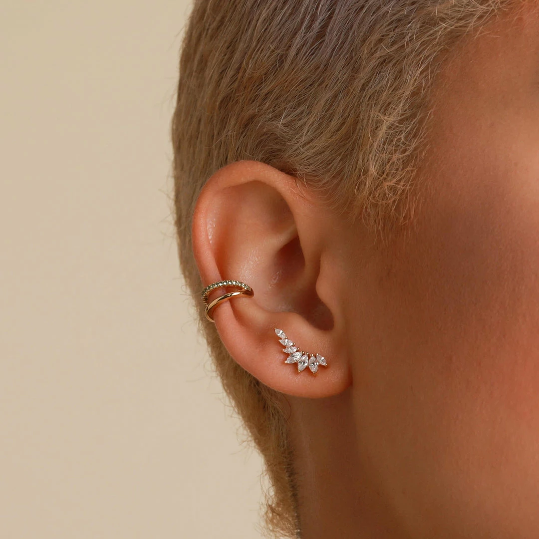 Turns out that all that glitters really is gold ~ the Glimmer Navette Stud Earrings in Gold has a trail of sparkling cubic zirconias for a statement look. Wear these in your lobe for the ultimate party look, either in your first lobe or in your upper lobe with a pair of chunky hoops.