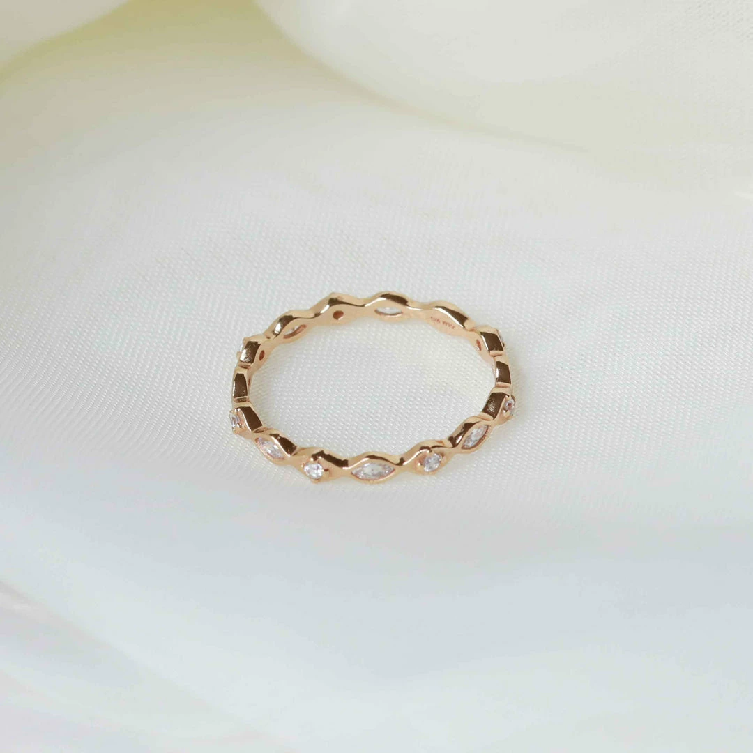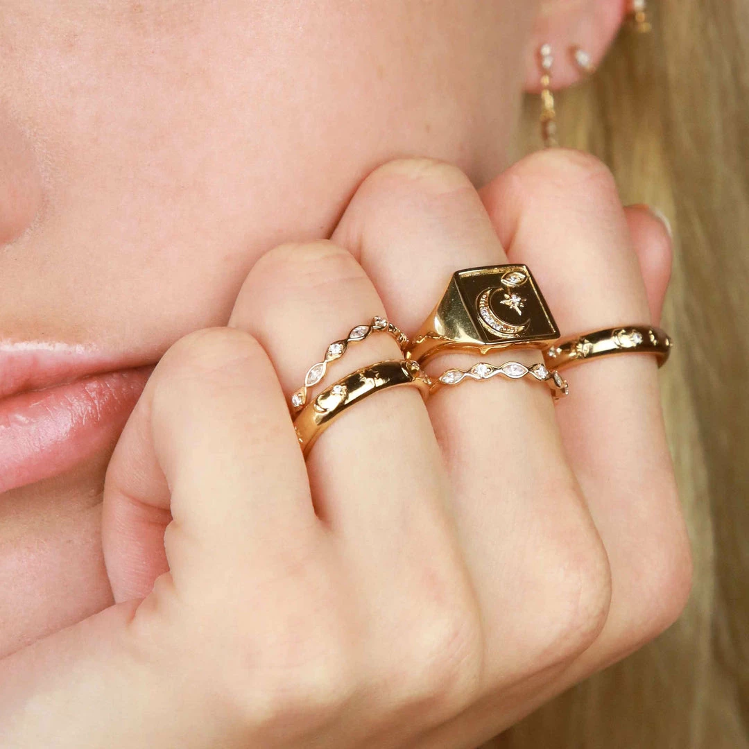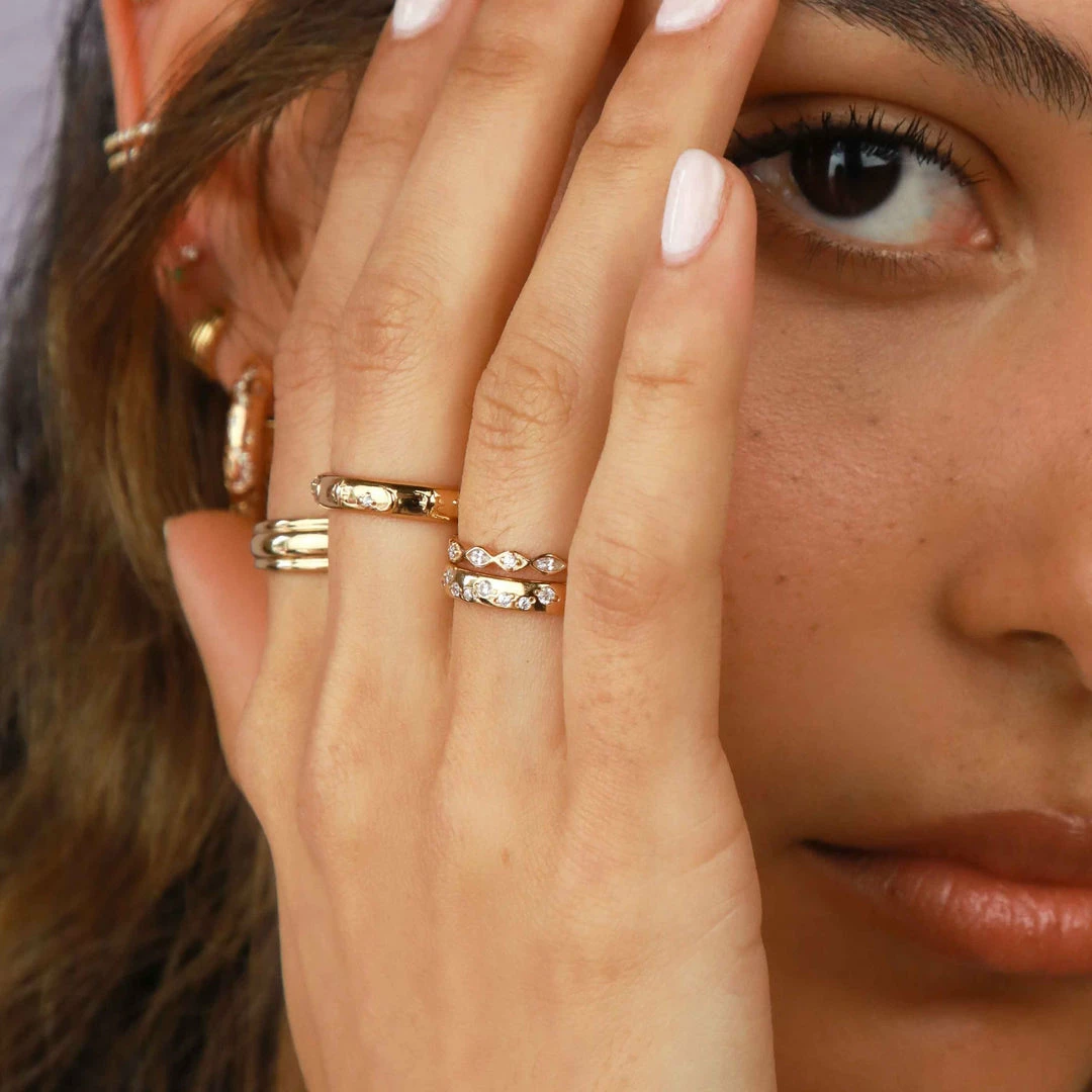Achieve the ring stack of your dreams ~ add the Navette Crystal Band Ring in Gold to your collection for an all-out sparkling moment. With navette crystals all around, this is for when you want to let your hands do the talking. It’s on a dainty setting, so it’s easily stacked with other A&M ring styles.