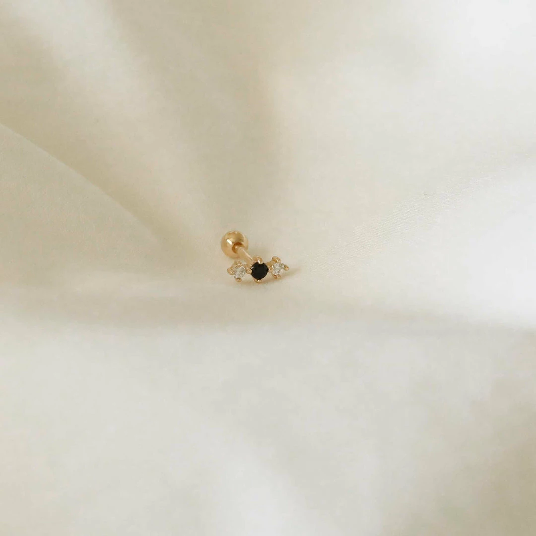 The new season calls for new jewels, and the Black Crystal Stacked Barbell in Gold is the best way to update your piercings. With three dainty stones in a line with a central black crystal, this has the appearance of a stacked look, while only needing one piercing. Wear in your lobe, conch, helix or tragus piercing and give your ears the sparkle they deserve.