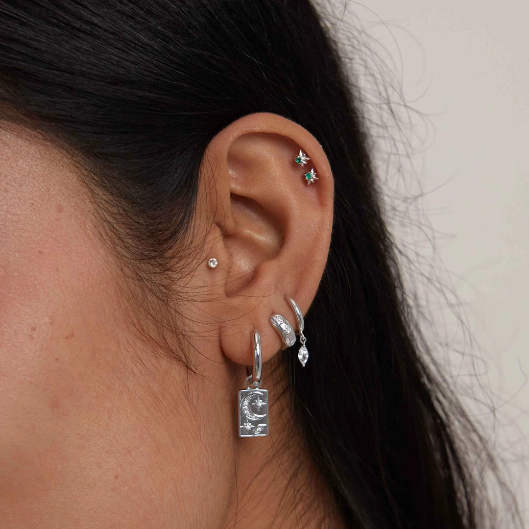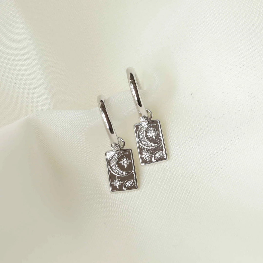 Stars in your eyes (and ears) ~ the Celestial Charm Hoops in Silver add a mystic vibe to your stack. Classically A&M, these feature dainty star & moon engraving on a rectangular charm for a statement look. Cubic zirconia inlays add a sparkling finish, so you can wear these to take your look from day to night.