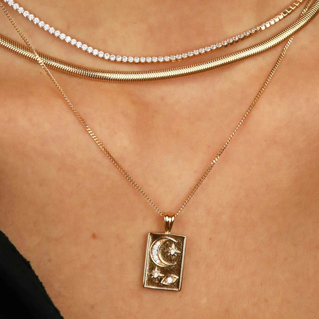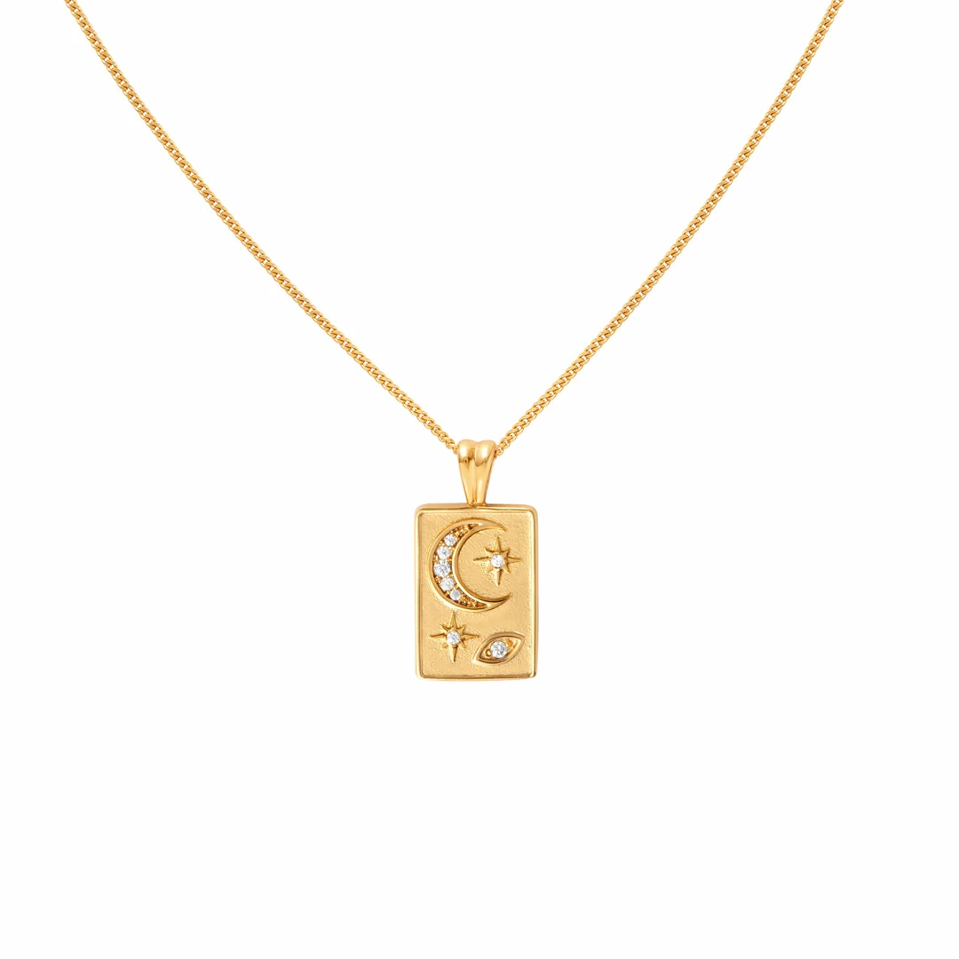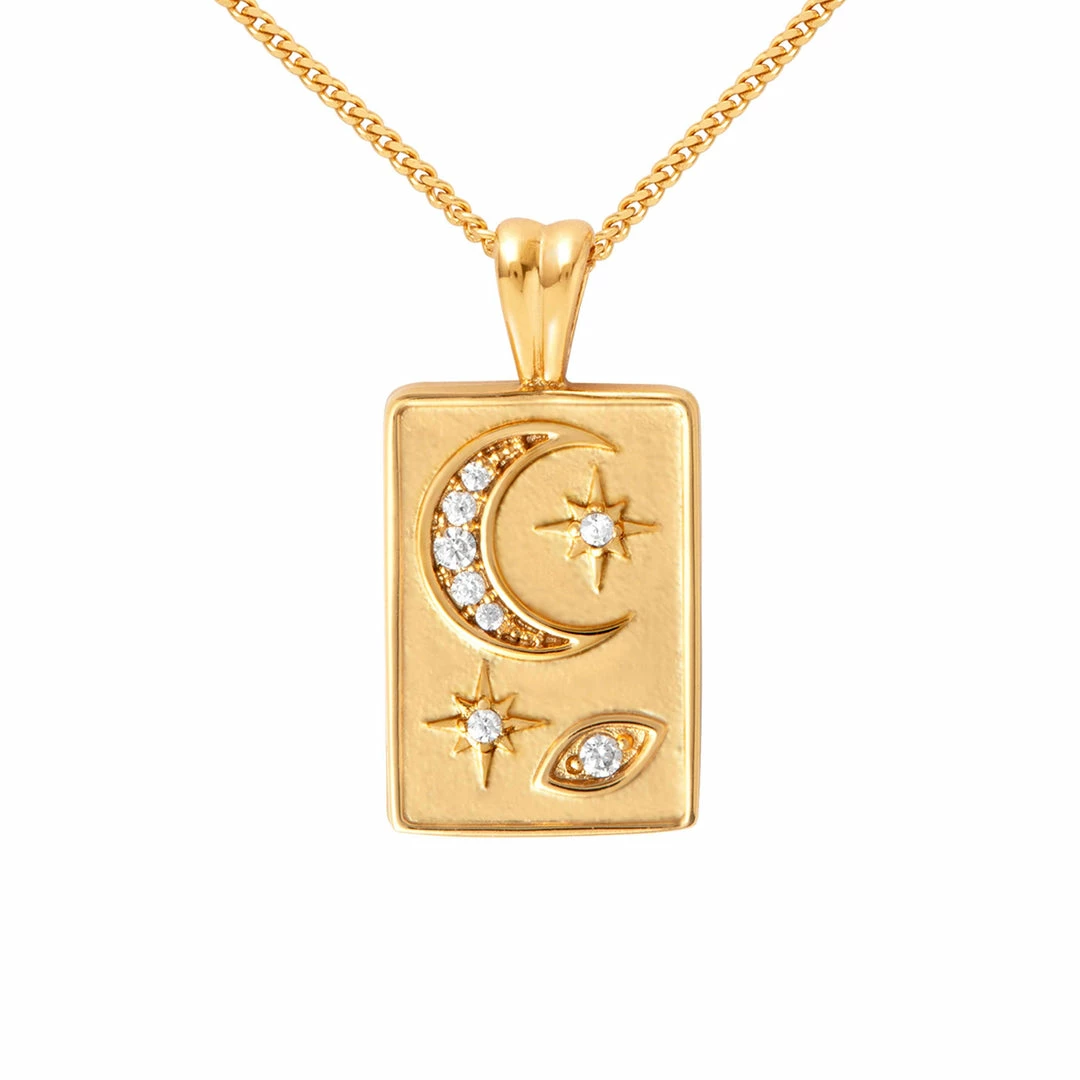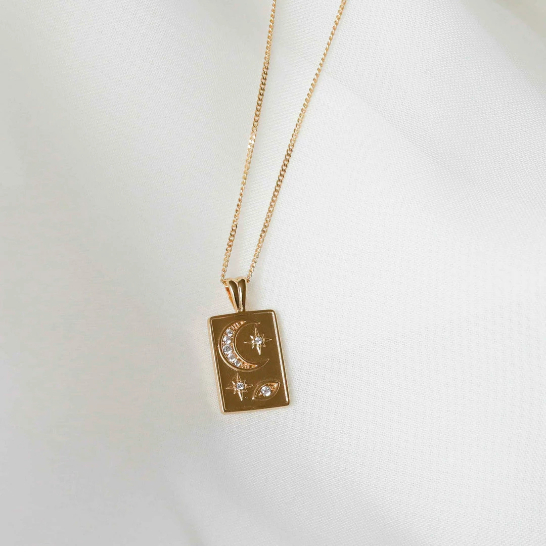 iThe necklace stack of your dreams ~ the Celestial Pendant Necklace in Gold is for all the mystics in your life (including you). Engraved in a dainty moon & star motif, this is in a rectangular ‘ID’ style to fit in with your existing necklace stack with ease. Layer it up with dainty pendants & chunky chains for a curated look to wear everyday.