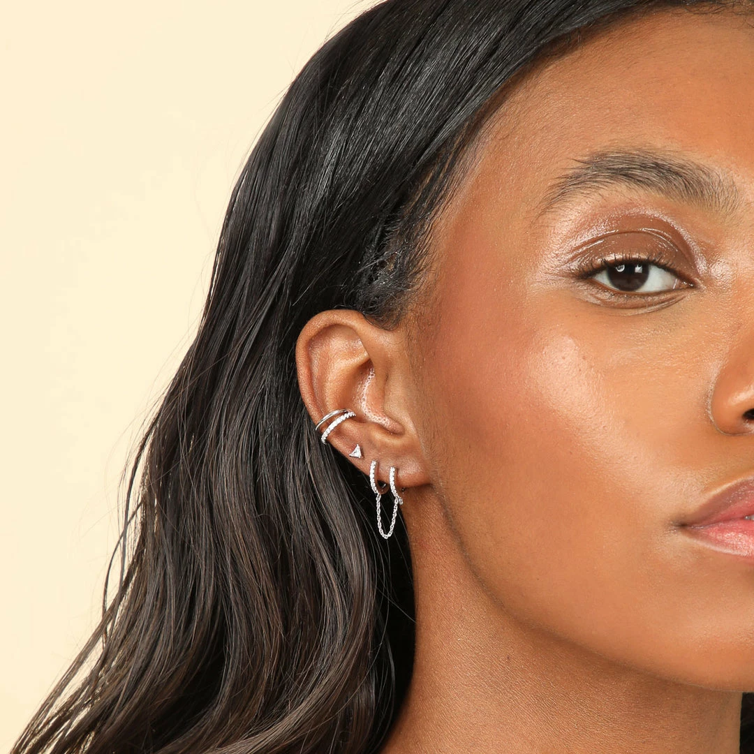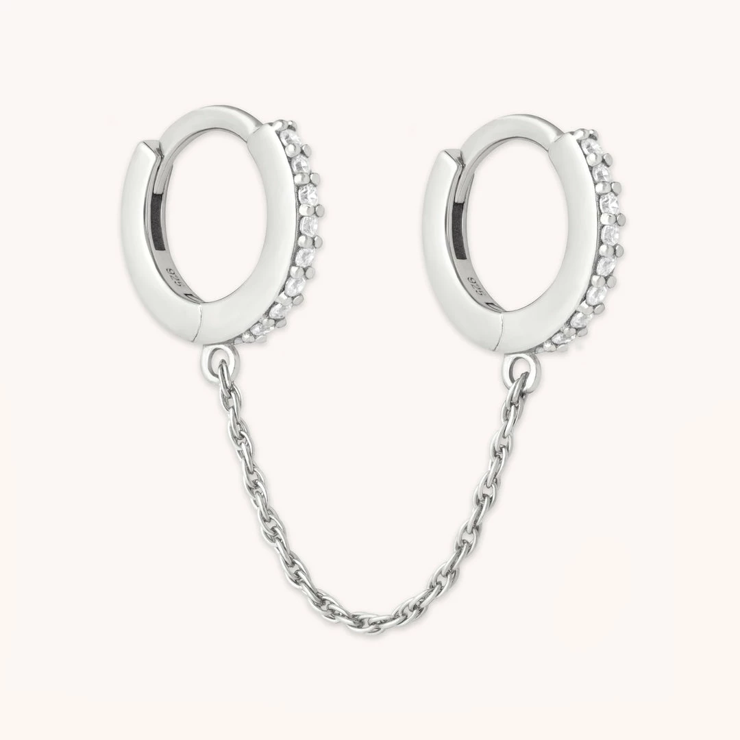 The piece that links everything together. The Chain Link Huggies in Silver are a perfect way to add texture and movement to your stack. Two huggie hoops are connected by a dainty chain – stack them next to eachother, or alternate with another huggie or stud.Â