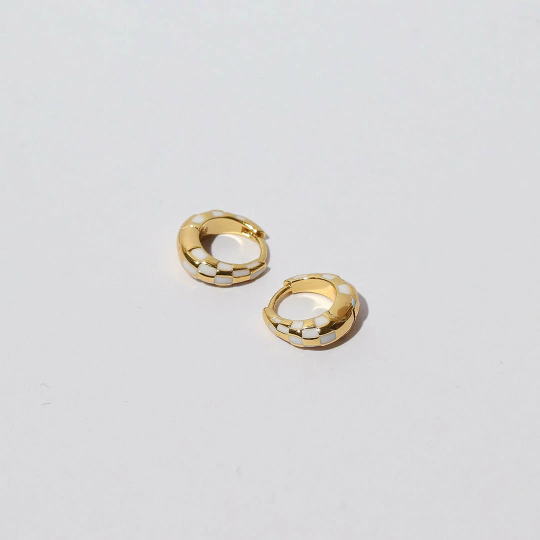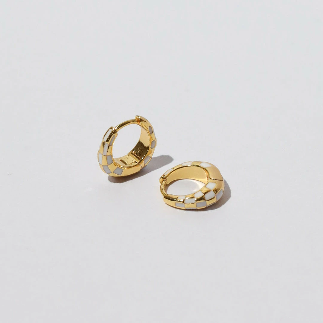 New huggies? Check. The Checkerboard Huggies in Gold are the fun statement your ear stack needs for summer. In our best-selling huggie hoop size, these feature a 70s-inspired checkerboard design to elevate your collection. Wear with the Checkerboard Pendant Hoops to coordinate the look.Â