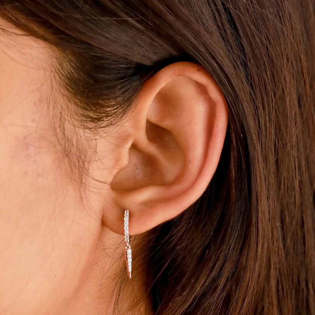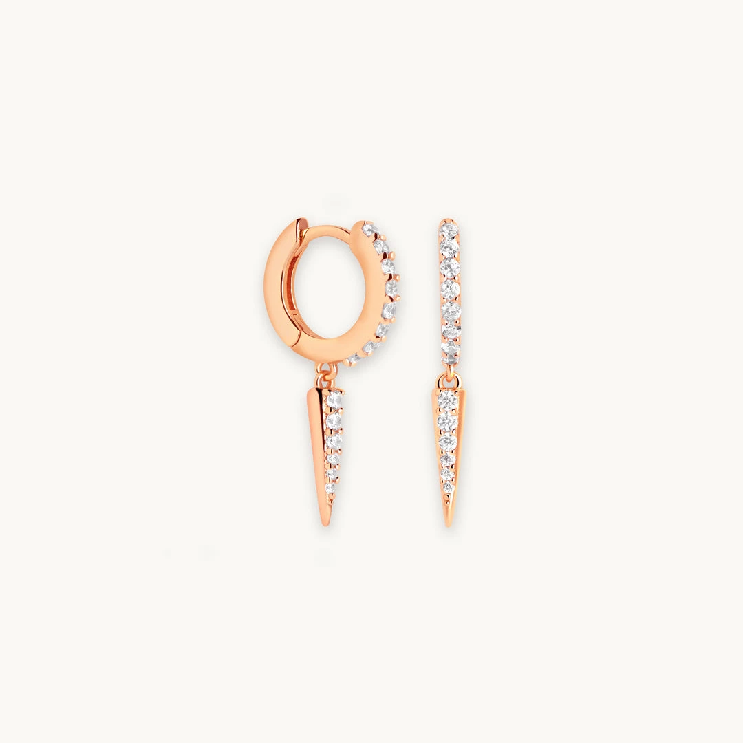 Huggies, but with an extra little something. The Crystal Spike Huggies in Rose Gold are paved in sparkling cubic zirconias for a statement look. A spike charm adds an eye-catching finish, and allows you to add different lengths to your ear stack. Wear them with our simpler styles for a stacked up look, or just on their own for an everyday vibe.