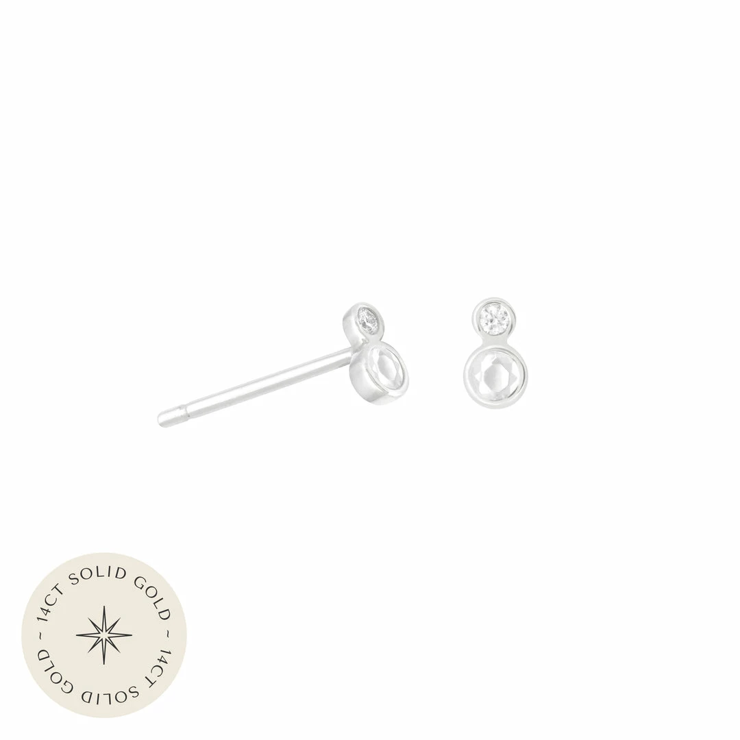 Thanks, they’re 14ct Recycled Solid Gold. The Solid Gold Double Topaz Stud Earrings are an ear stack addition that will stay with you forever. They’re in a dainty style, with a double white topaz inlay to add a luxe sparkle. Wear them alone, or stack them with the Solid Gold Topaz Hoops for a curated look.
