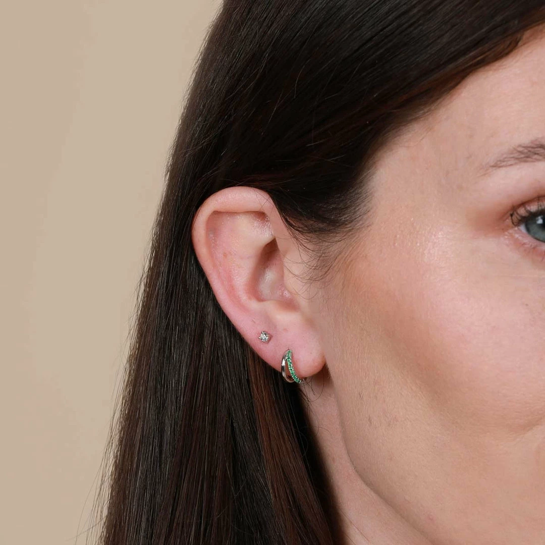 Your go-to huggies have had a fresh update ~ meet the Duo Emerald Huggies in Silver. With the look of two hoops in one, these feature one plain and one crystal jewelled hoop with emerald green cubic zirconias. They’re the perfect way to achieve the stacked look with only one piercing. Our duo huggies are also available with aquamarine or pink sparkly cubic zirconias!