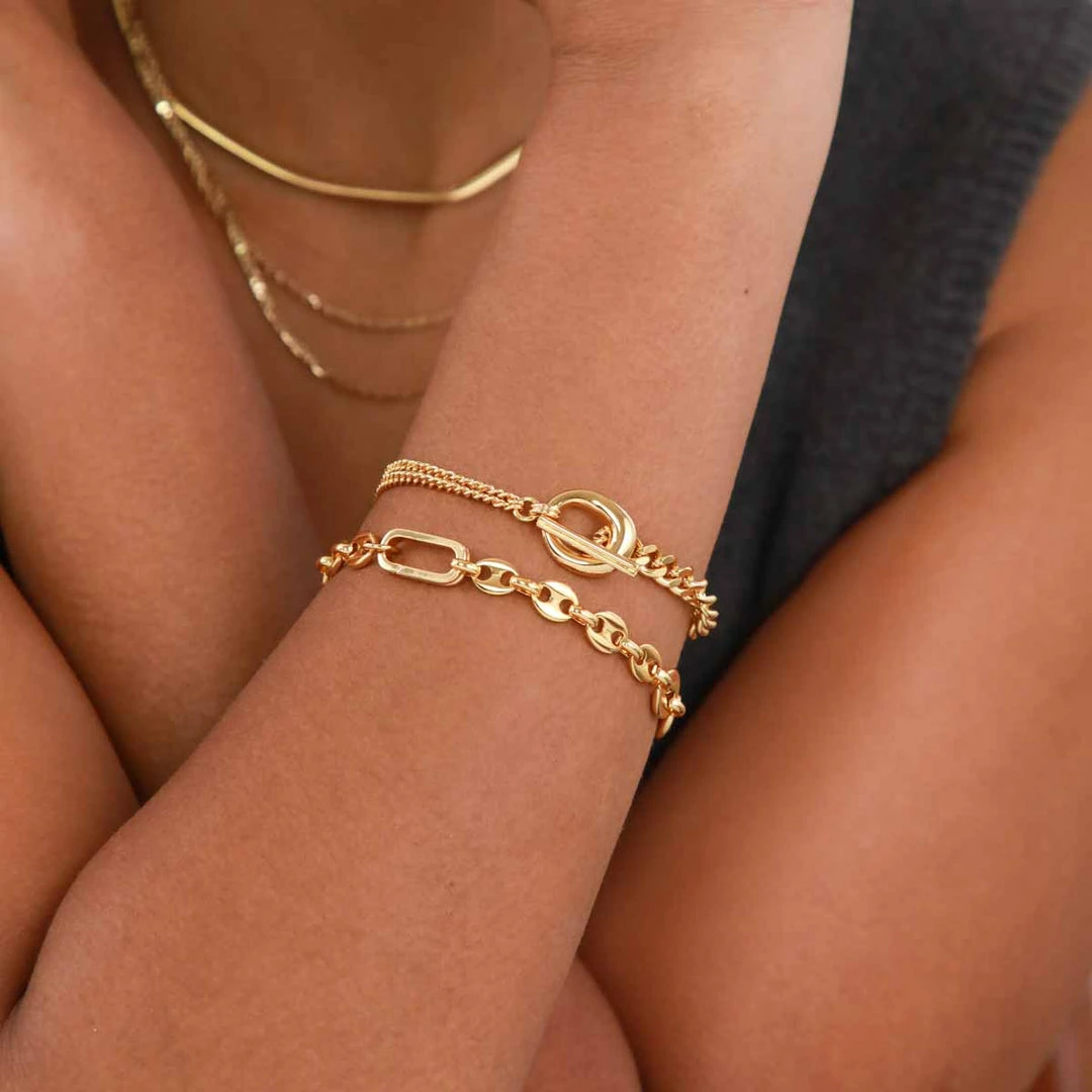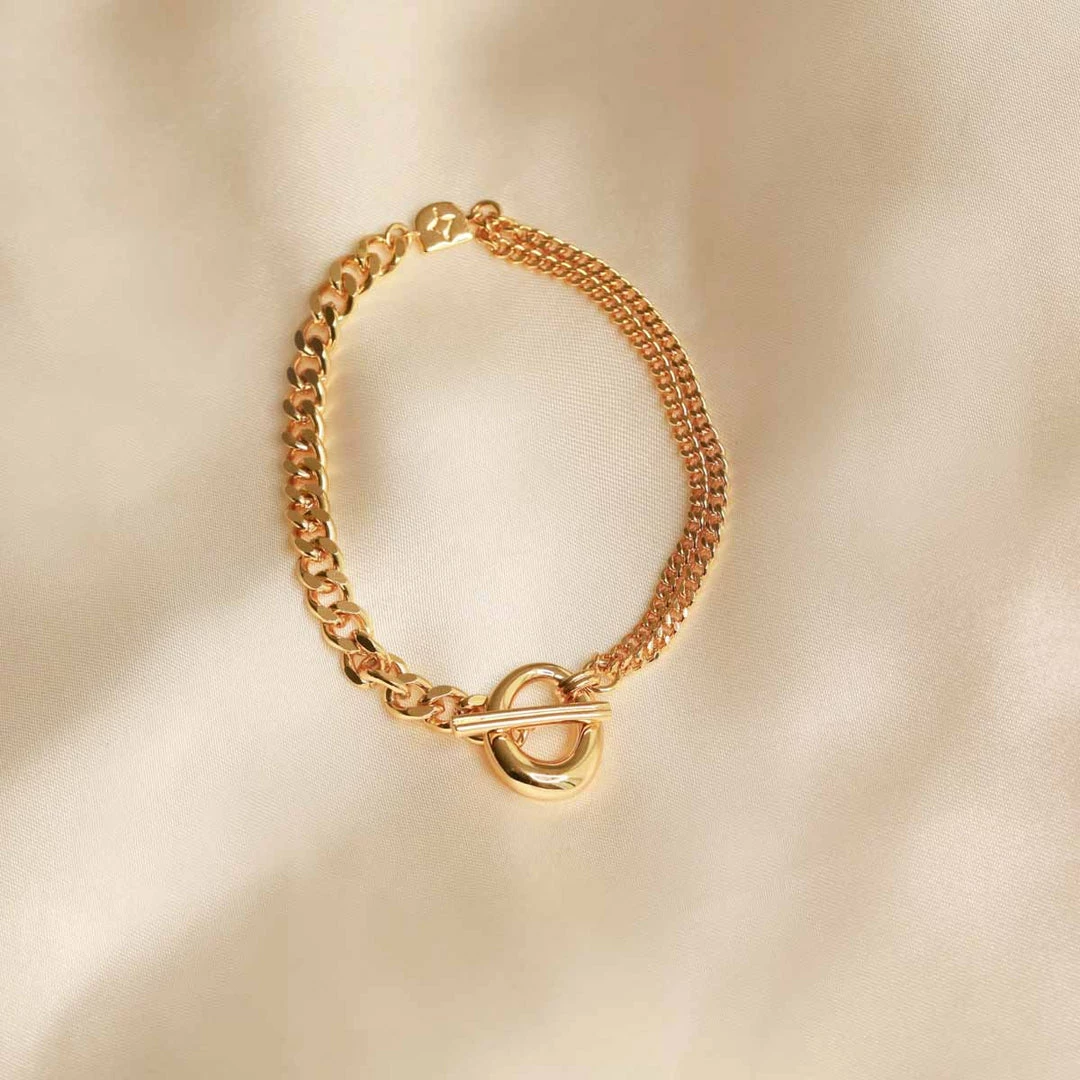 The bolder the better ~ the Duo T-Bar Bracelet in Gold is a statement addition to your wrist. Featuring a chunky T-bar fastening and two different chain styles, this bracelet is a simple & effective way of achieving the stacked look. Wear alone, or layer with other bracelets for a curated vibe.
