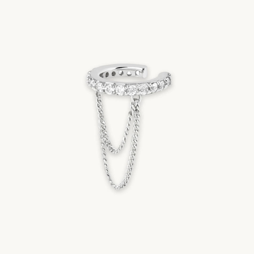 Every season is ear stack season, and the Crystal Chain Ear Cuff in Silver takes that to the next level. It’s paved in cubic zirconias for a statement sparkle, elevating any look from day to night. The double chain attached results in a draped look when worn, guaranteed to be an ear-stack hero. Pair with the Twilight Chain Huggies for a mystic statement.
