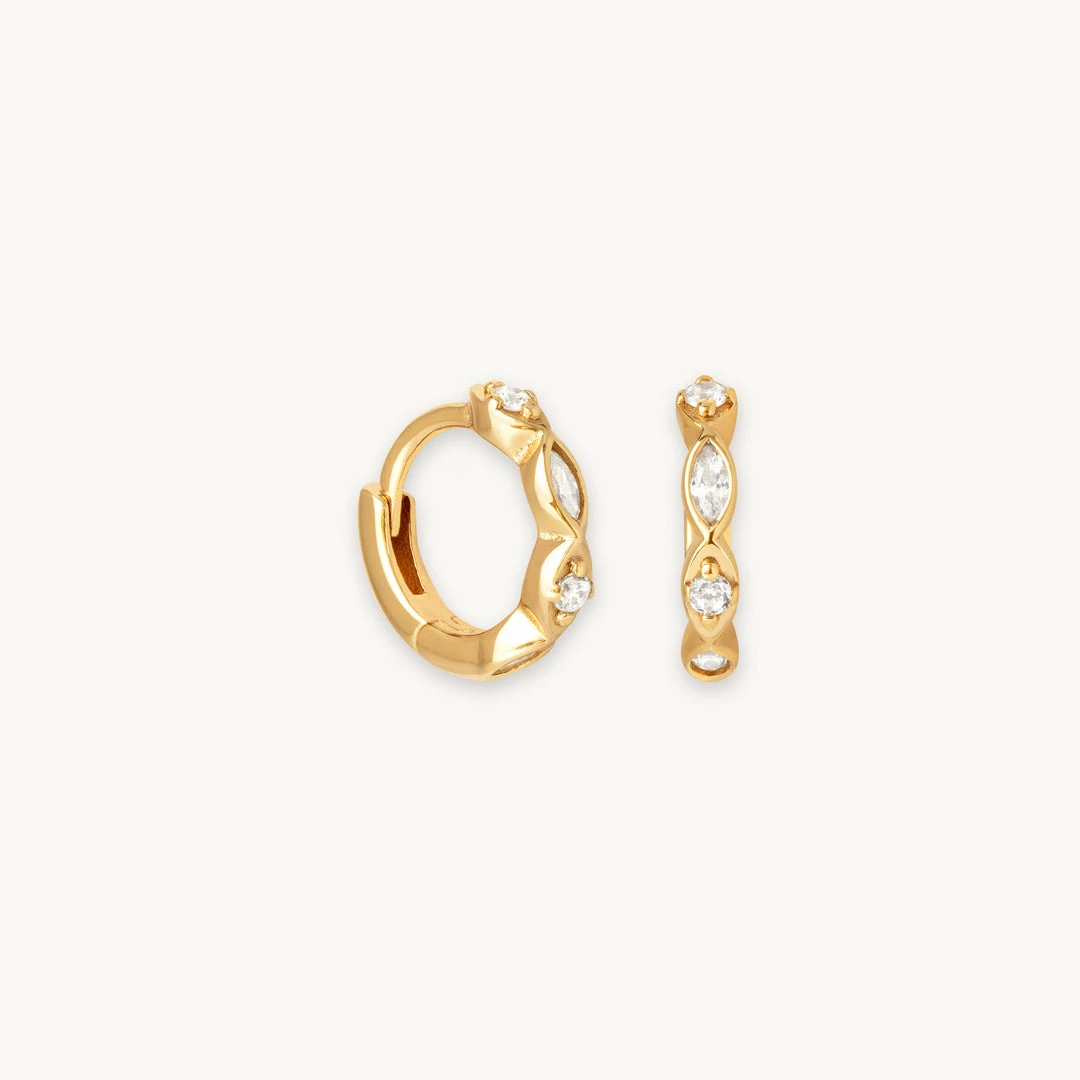 Huggies so sparkly they look out of this world. The Ethereal Crystal Huggies in Gold give your ears the shine they deserve. They feature on-trend navette stones, which match our best-selling Navette Fan Barbells (perfect if you like to coordinate). Wear these in your first lobe piercing for an everyday look, or stack with chunky hoops & ear cuffs for a night-out vibe.