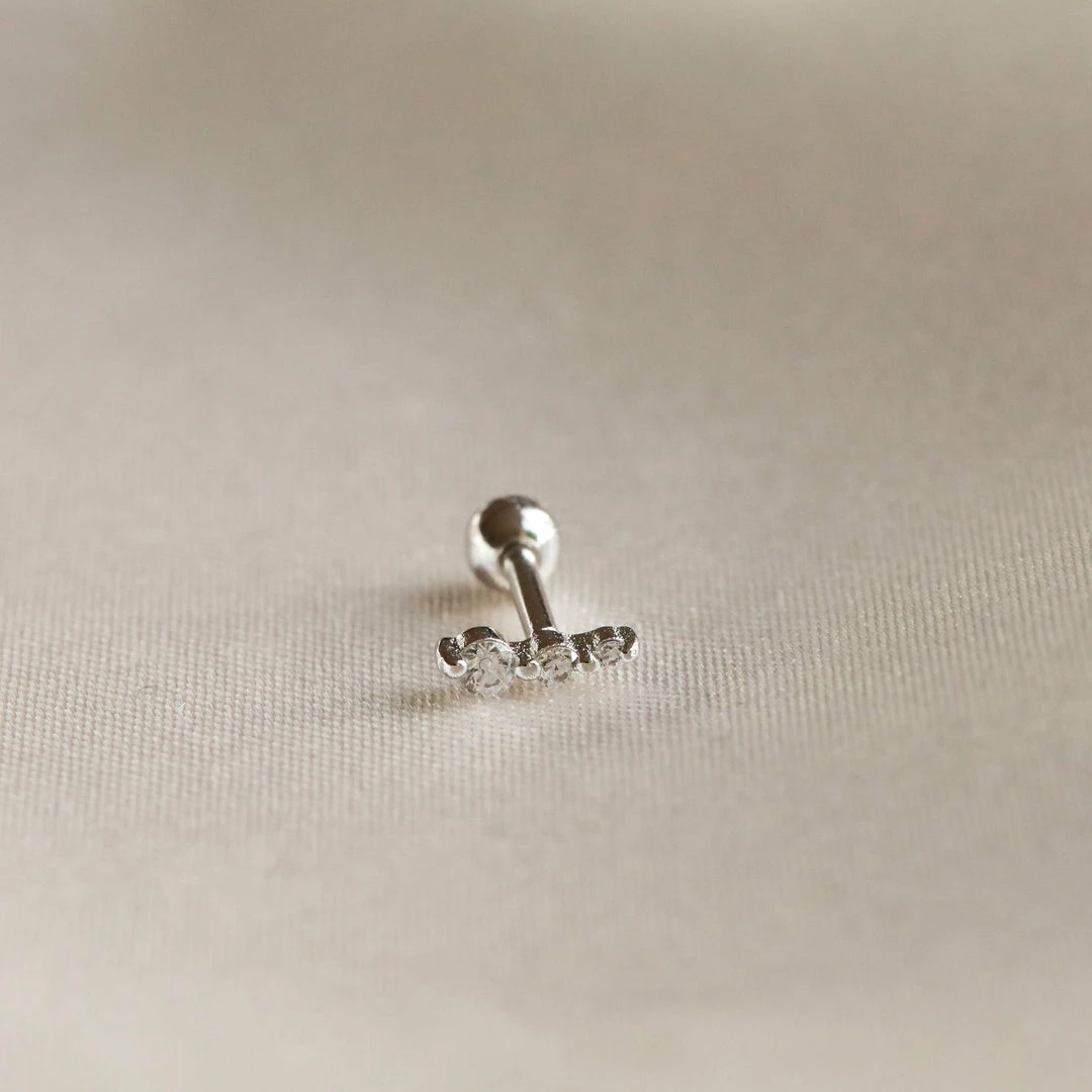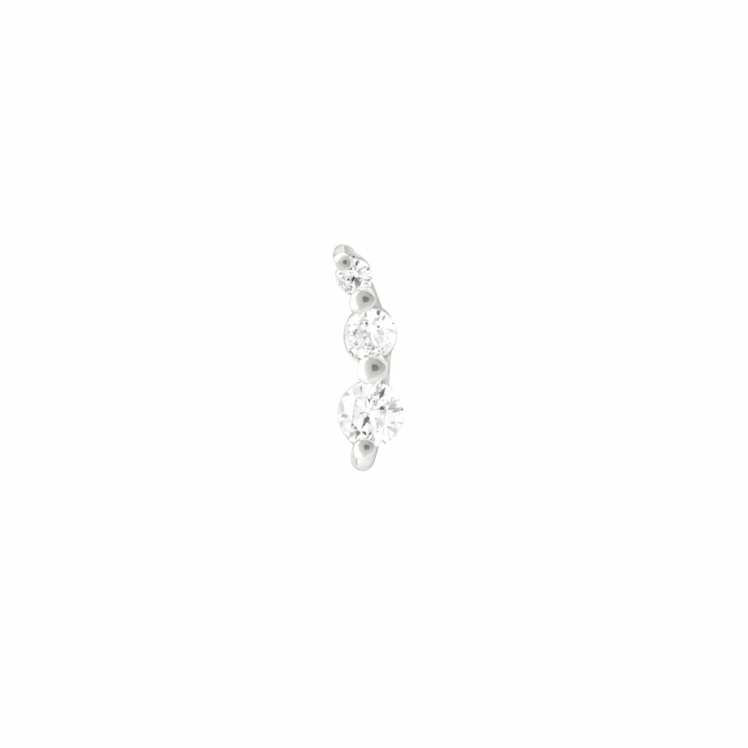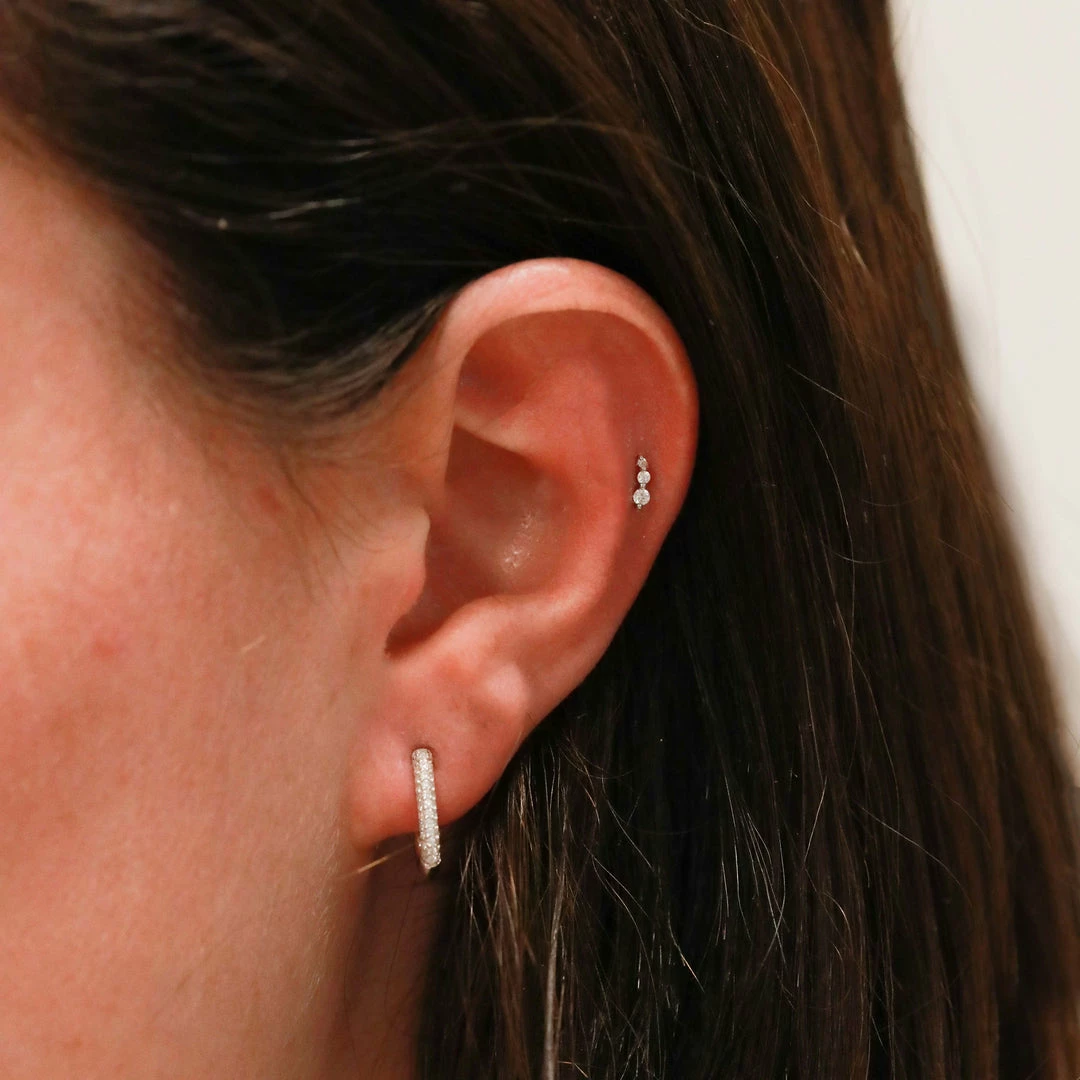 Treat yourself (and your piercings) to the Glimmer Crystal Barbell in Silver, featuring three shining cubic zirconias in a trailing shape. It will fit perfectly in your lobe, helix, conch or outer conch ~ it’ll give your piercings the attention they deserve. Wear it with any of our sparkly huggies or ear cuffs for the ultimate party stack.