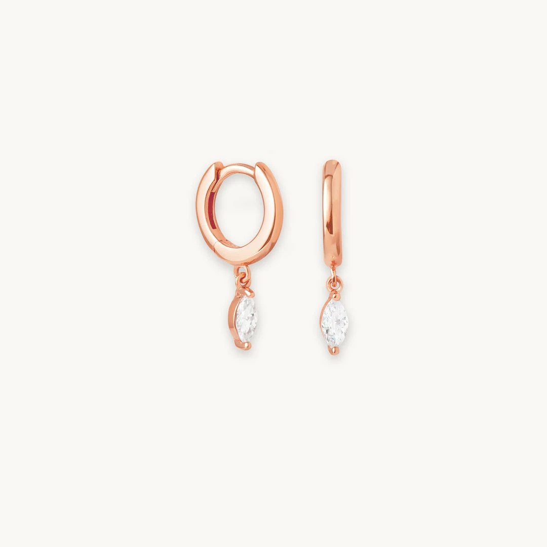 Simple huggies, with added sparkle. The Navette Charm Huggies in Rose Gold feature a dainty cubic zirconia in a marquise setting to add a sleek touch of sparkle. You can wear them in your first lobes for an everyday look, or stack them in your upper lobes with a pair of hoops for a going-out vibe. Pair with the Navette Long Chain Huggies or Navette Short Chain Huggies to add texture to your stack.