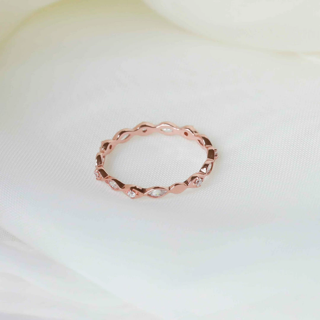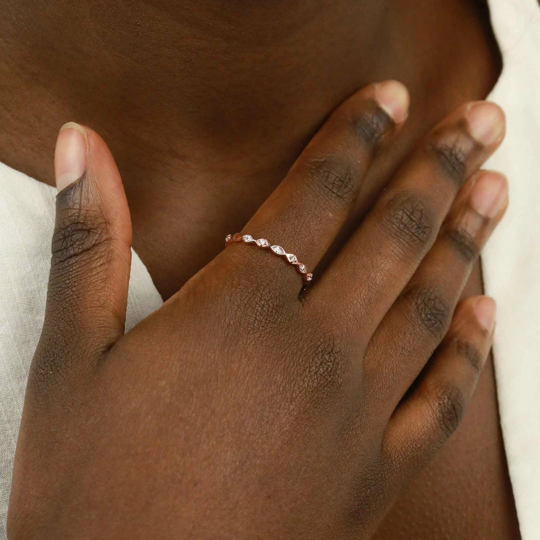 Achieve the ring stack of your dreams ~ add the Navette Crystal Band Ring in Rose Gold to your collection for an all-out sparkling moment. With navette crystals all around, this is for when you want to let your hands do the talking. It’s on a dainty setting, so it’s easily stacked with other A&M ring styles.
