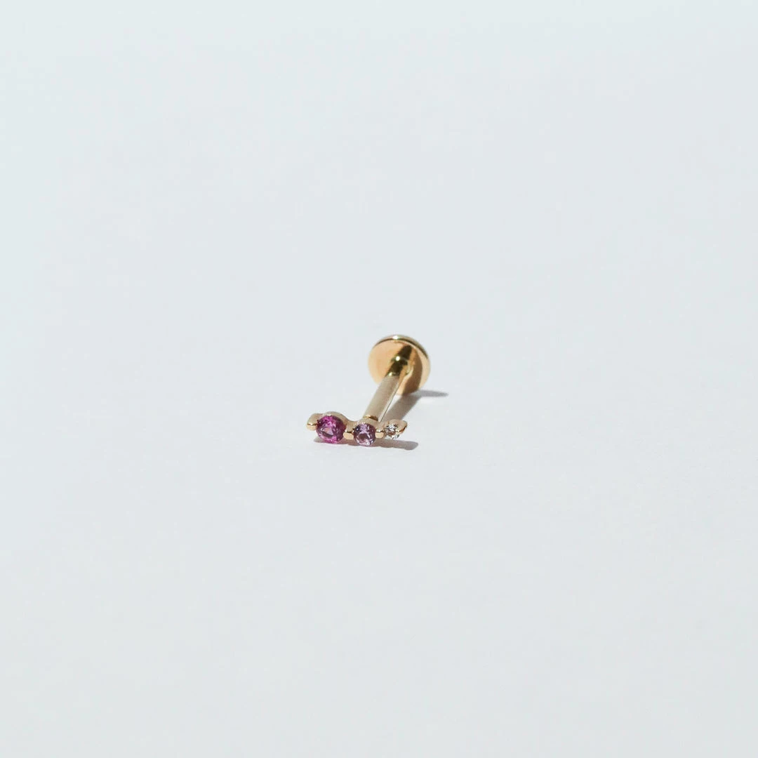 Add a pop of colour with the Pink Gradient Piercing Stud. With two shades of pink sapphire (symbolising love & compassion) and one white topaz stone (the stone of manifestation), this piercing stud adds a pretty pink sparkle to any stack. Wear it in your lobe, tragus, conch or helix piercing – and it’s made from 14k recycled solid gold so you can keep it in your piercings year after year.