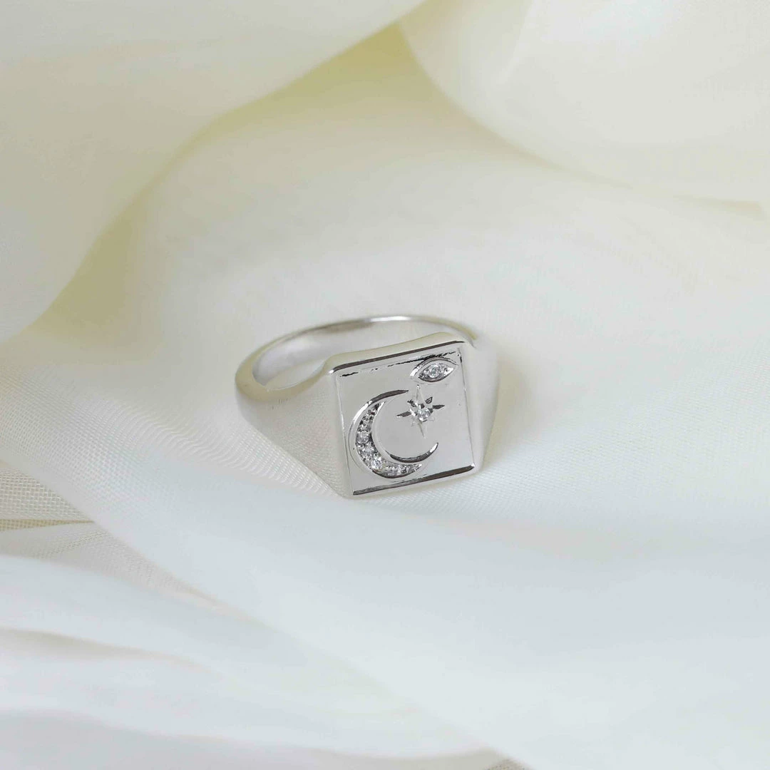 Mystic motifs to lift your spirits ~ the Celestial Signet Ring in Silver is a timeless treasure with a sparkling twist. In a classic signet style, this features a rectangular design with star & moon engraving for a celestial vibe. Completed with cubic zirconia inlays, this is really a statement piece. Wear it alone for a sleek look, or stack it up with our other rings (remember, more is more).