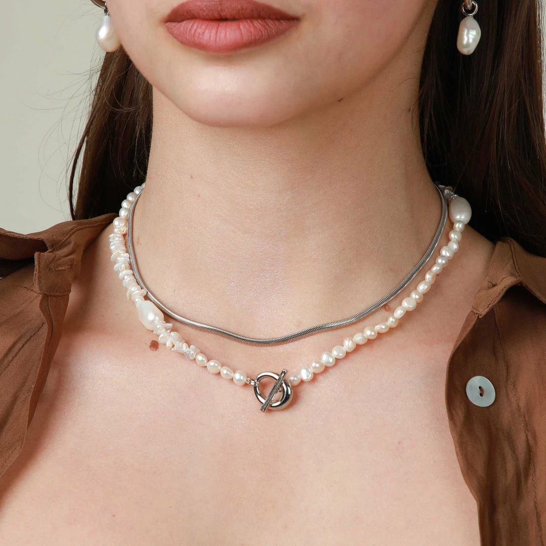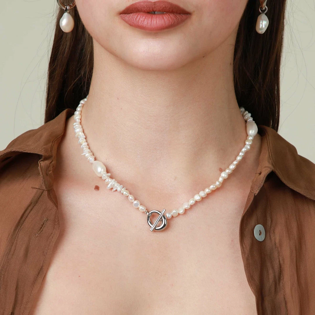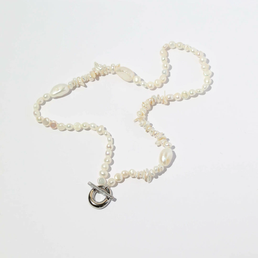 A pearl of wisdom: the Serenity Pearl Beaded T-Bar Necklace in Silver is the perfect addition to your summer stack. With freshwater pearls in organic shapes and textures, this necklace features a bold T-bar closure to add a sparkly touch. Perfect for summer getaways and events, this timeless necklace will take you through all the seasons – making it a dreamy investment piece.