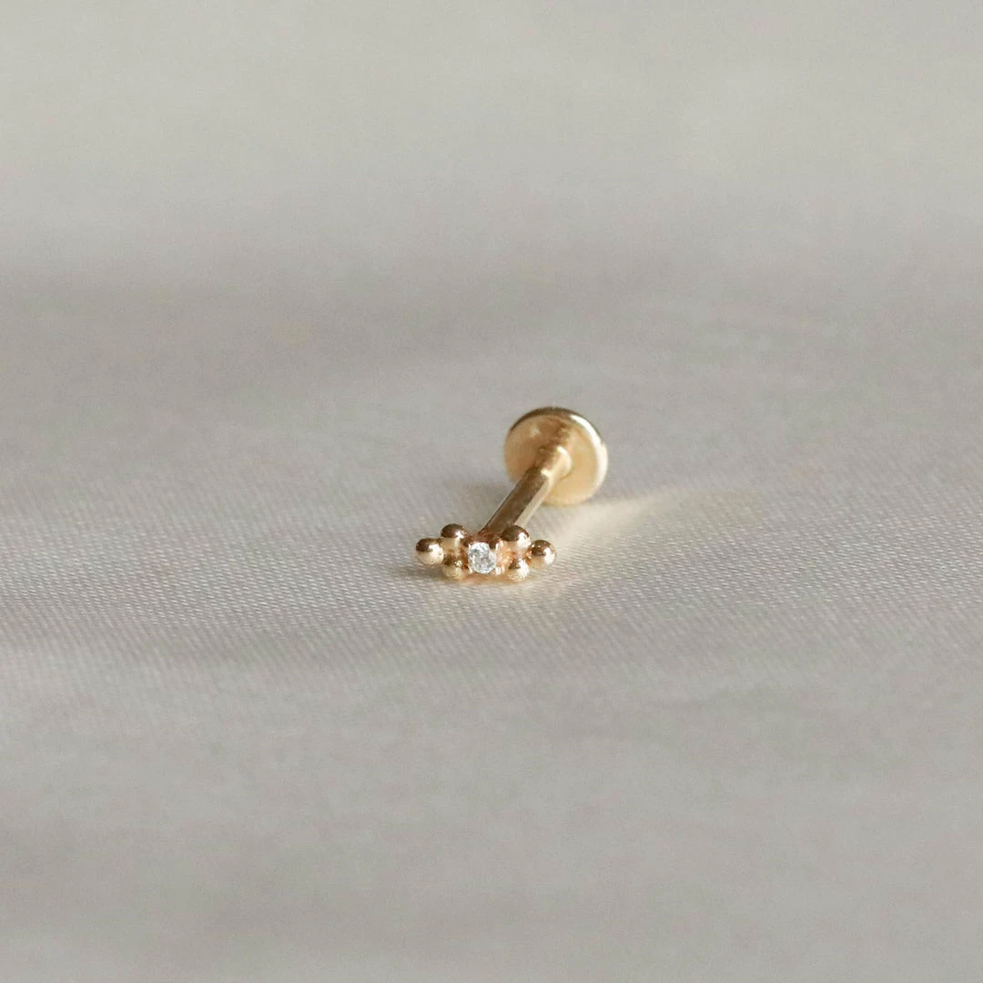 Statement sparkles for your piercings ~ the Solid Gold Crystal Beaded Piercing Stud in Gold features a central crystal inlay with a beaded design above and below. It adds texture to your stack, and will fit perfectly in your lobe, tragus, conch or helix piercing.