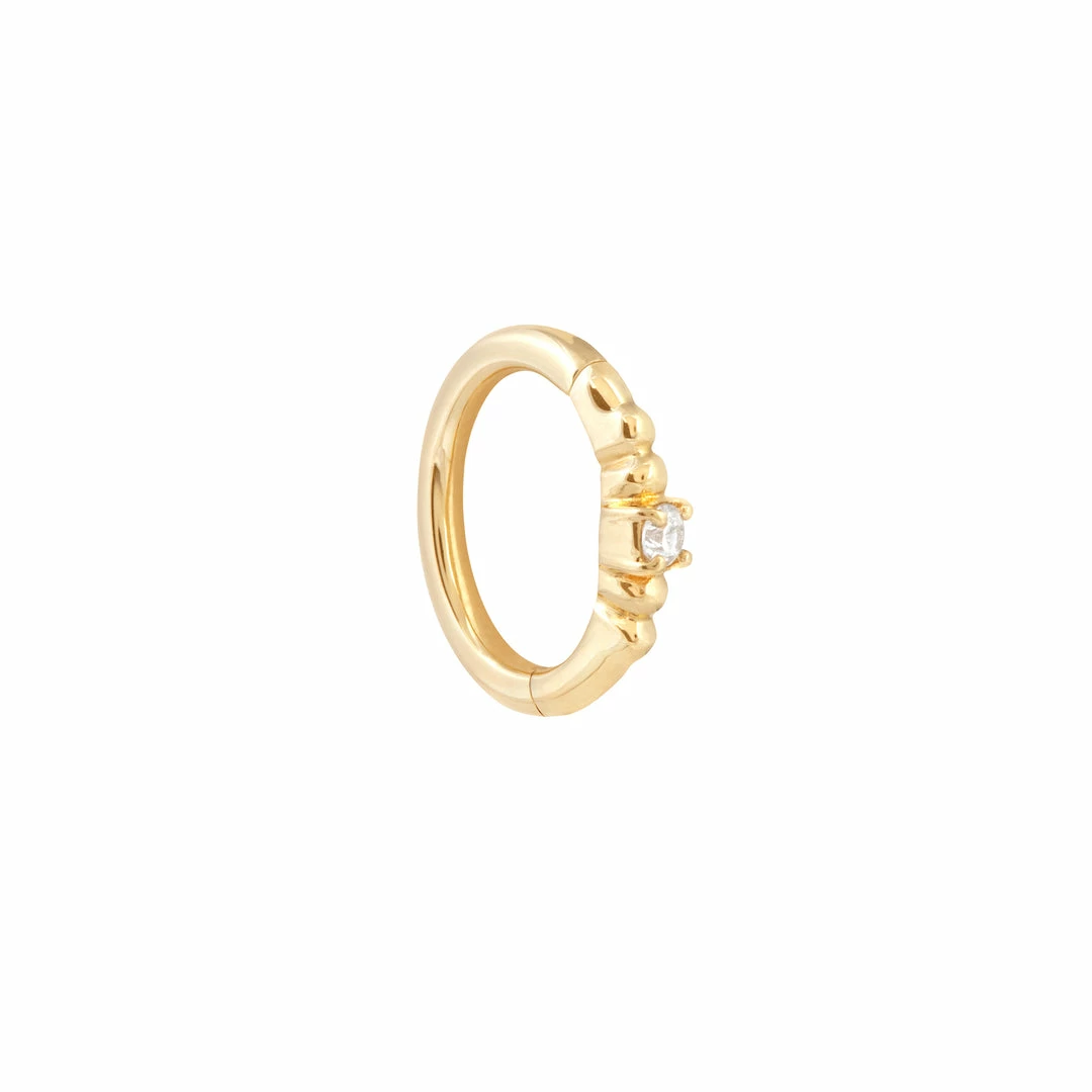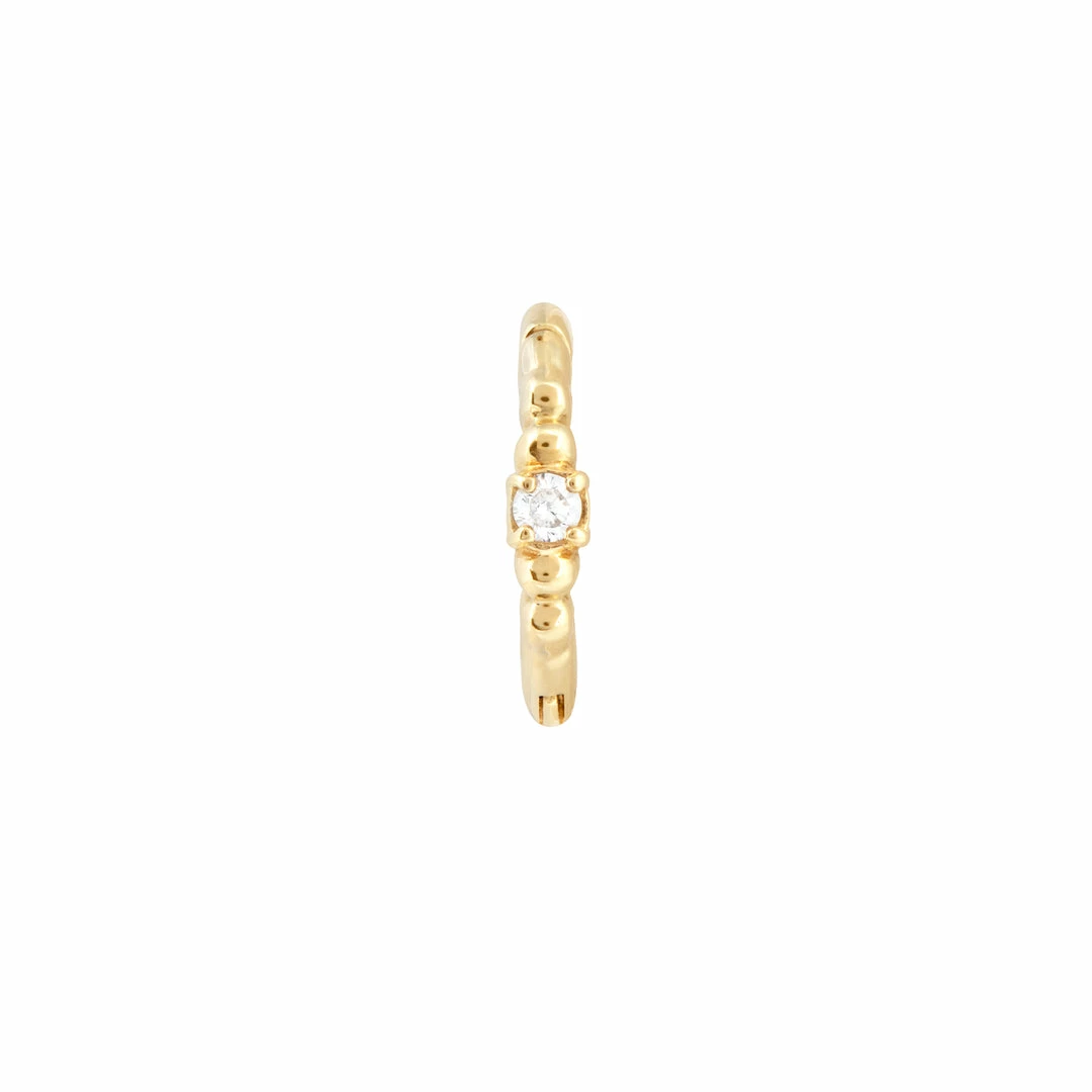 Piercing jewellery, A&M style. The Solid Gold Crystal Rook Hoop features a beaded texture & a central crystal inlay to add sparkle to your rook piercing. Plus, it’s made from 14ct recycled solid gold, so you don’t have to worry about taking it out.