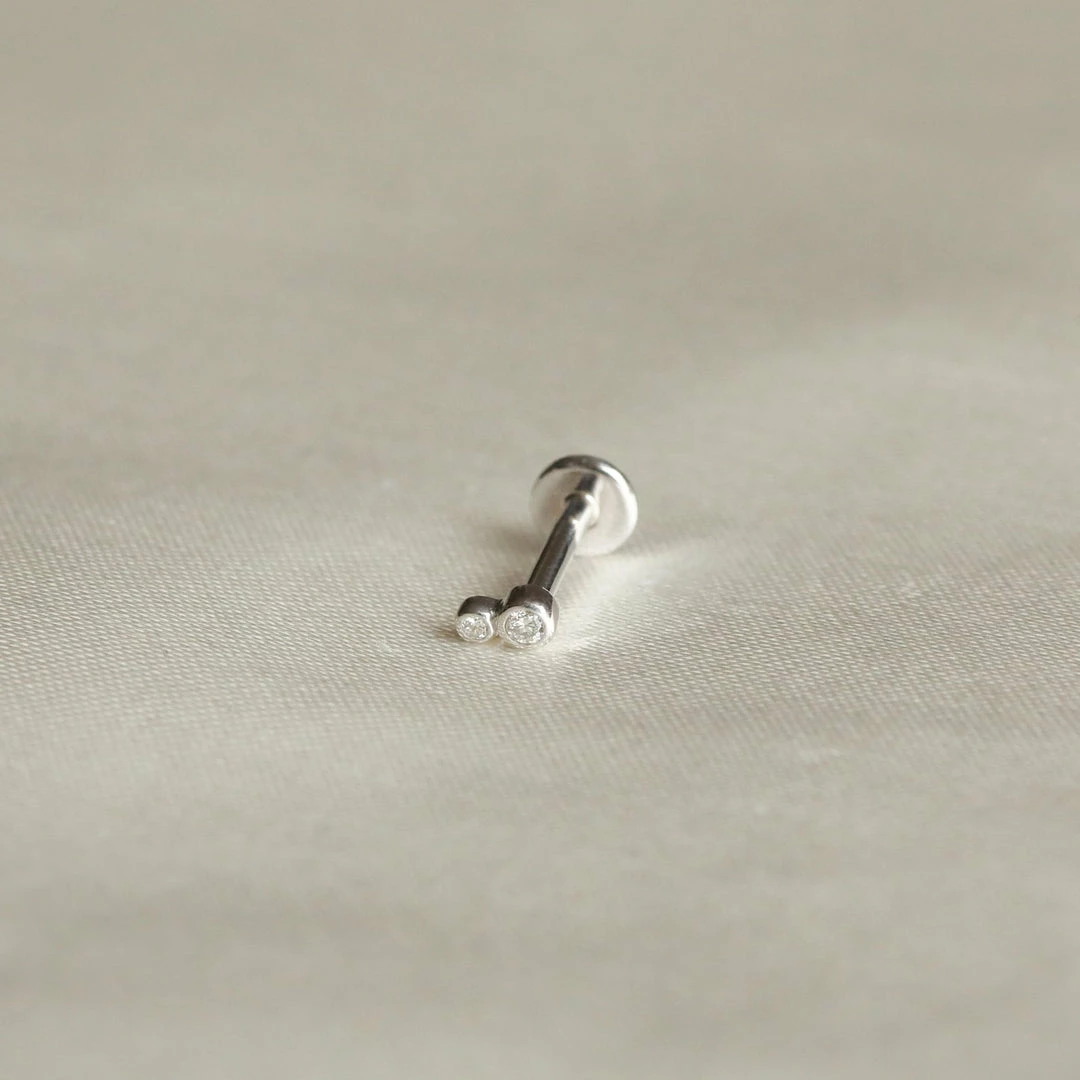 Recycled solid gold + lab grown diamonds = the conscious piercing jewellery of our dreams. The Solid White Gold Double Diamond Piercing Stud features two dainty lab grown diamonds for a subtle sparkle. Wear this in your lobe, tragus, conch or helix piercing – and choose between a 6mm or 8mm post for the perfect fit.