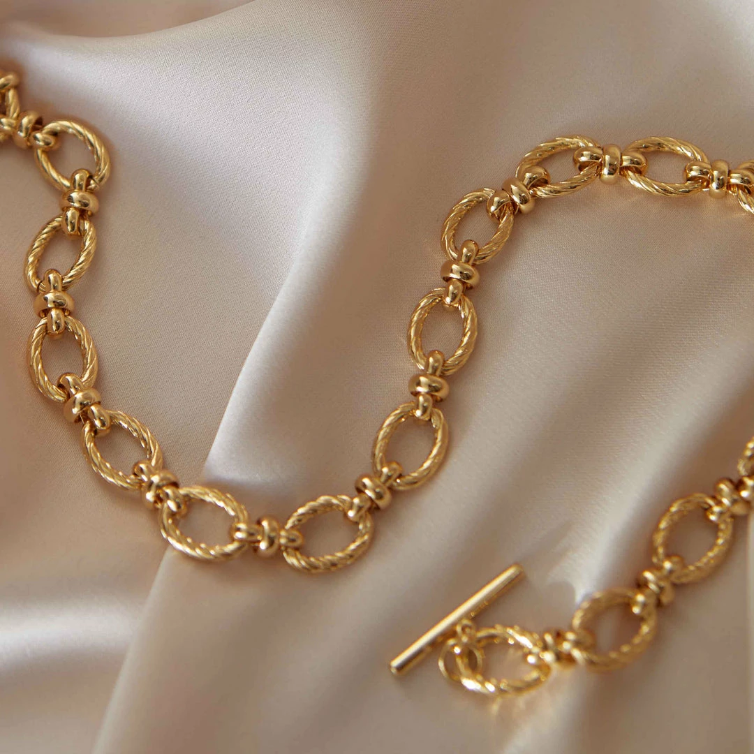 Chunky and classic, our textured gold t-bar bracelet simply screams vintage vibes. Perfect for styling with rings or match with a pair of chunky gold hoops for a coordinated look. Explore your style and follow us on Instagram for more inspiration.