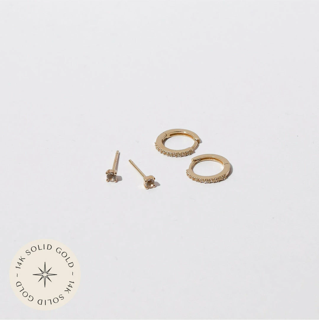 You deserve to shine, which is why we’ve curated the White Topaz Stacking Set in Solid Gold – featuring sparkling hoops and dainty studs. White Topaz stones promote clarity of thought, which is why they’re known as the stone of manifestation. Curated by our in-house stylists, or Solid Gold Stacking Sets are the perfect way to celebrate a special moment or occasion, or to keep for yourself to wear every day.