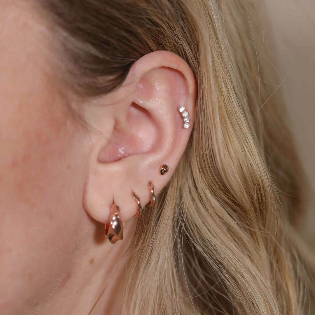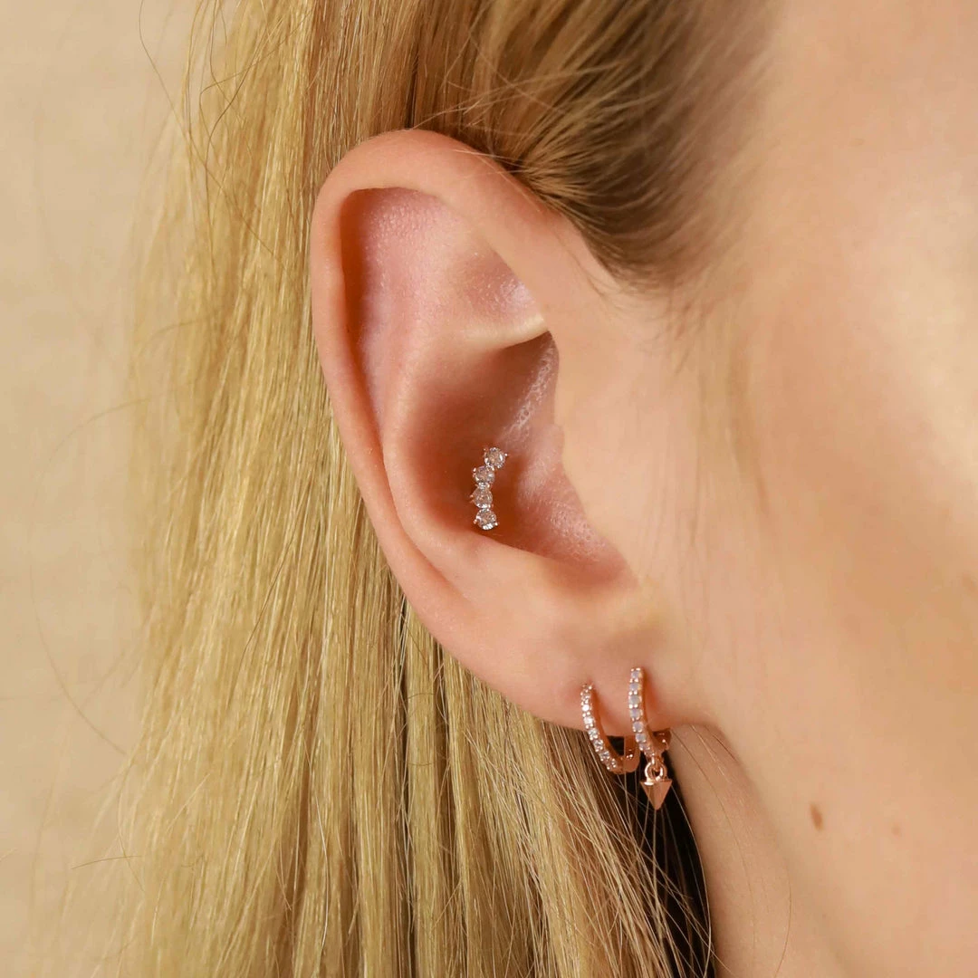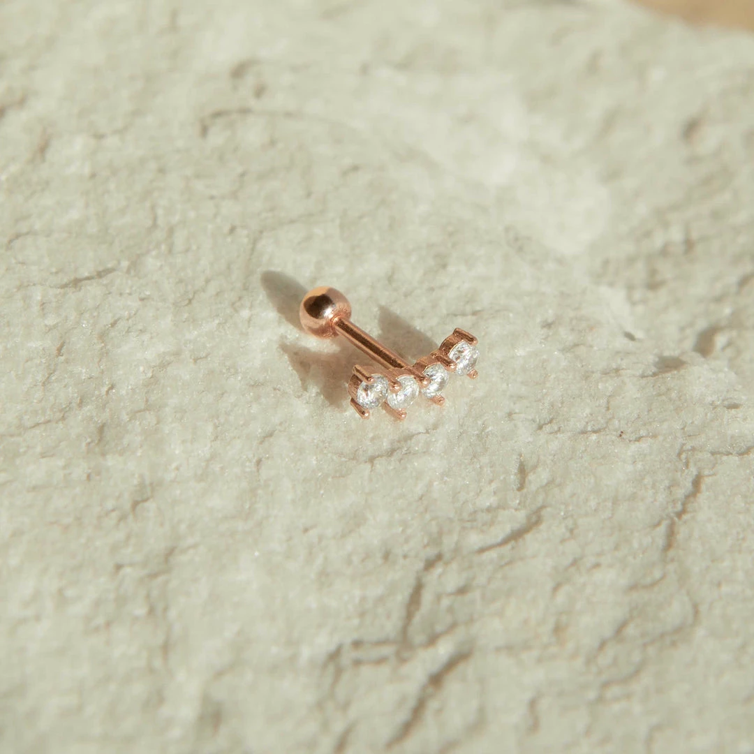 Inspired by your sparkle, the Curved Crystal Barbell in Rose Gold, featuring a trail of four sparkling cubic zirconias to let your piercings do the talking. The curved shape enhances the curves and shape of your ear perfectly – so it’ll fit you like a glove. Don’t have loads of piercings? These look great in your lobes too.