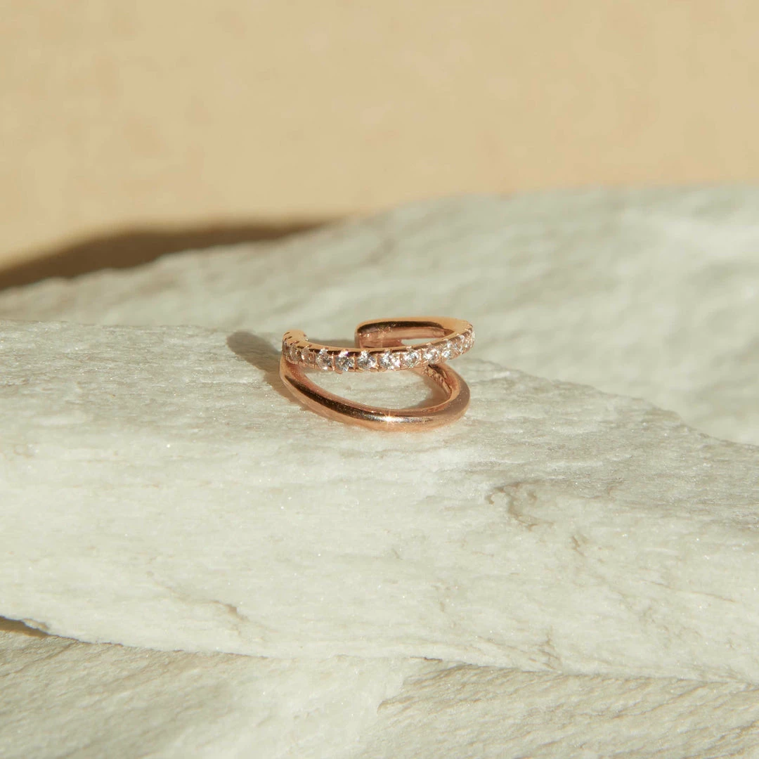 The beloved ear cuff: it’s a stacking staple here at A&M. With the Illusion Crystal Ear Cuff in Rose Gold, you get two for the price of one, with two dainty bars on one attachment. Paved with cubic zirconias, this cuff is the perfect way to add a subtle sparkle to your stack, when you want that extra glow. Wear with jewelled huggies & barbells for a look almost as shining as you.