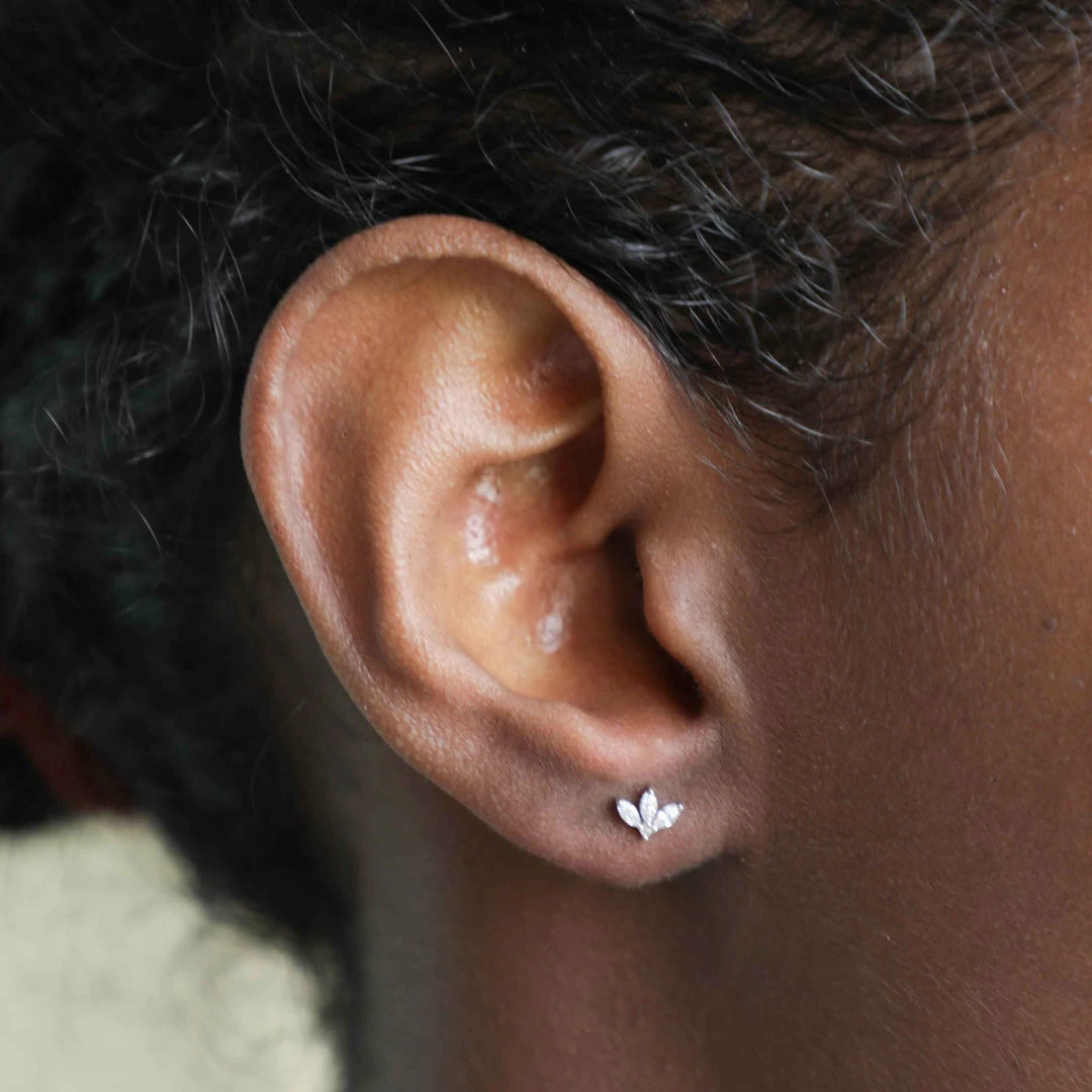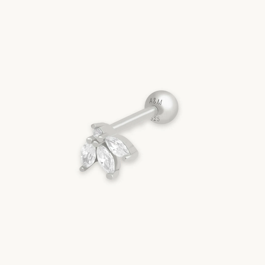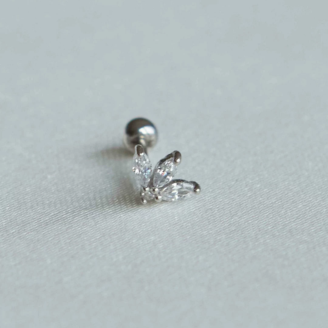 This navette crystal trio earring is the perfect crystal tragus/cartilage barbell earring. This unique piece may be tiny in size, but the three marquise-shaped sparkling cubic zirconias can make a statement and draw attention to your cute piercing.