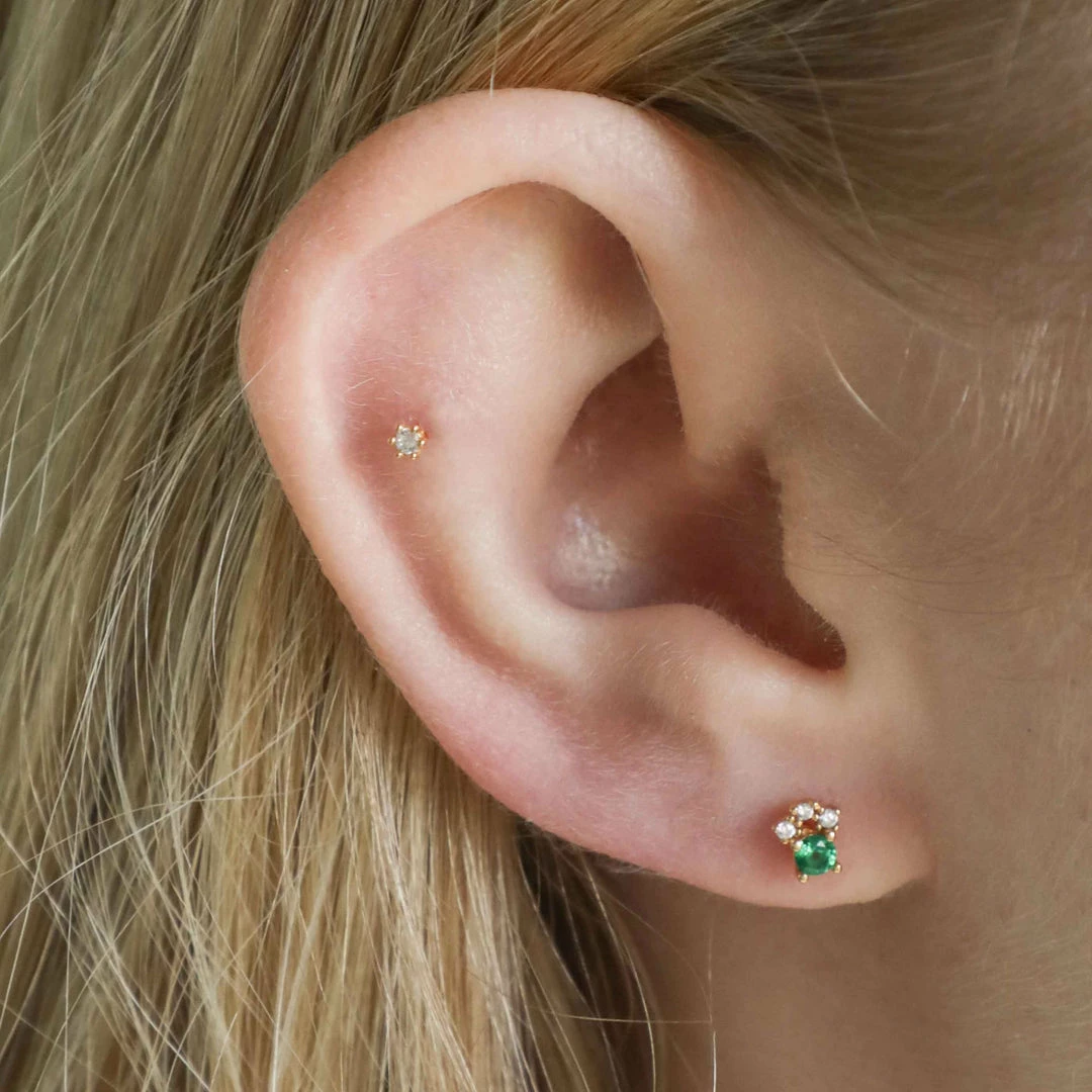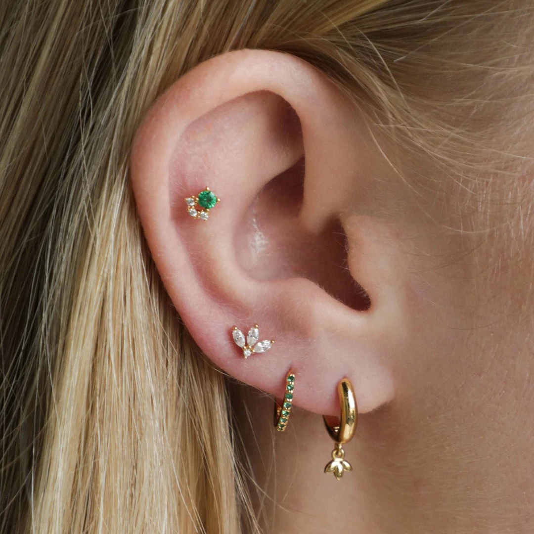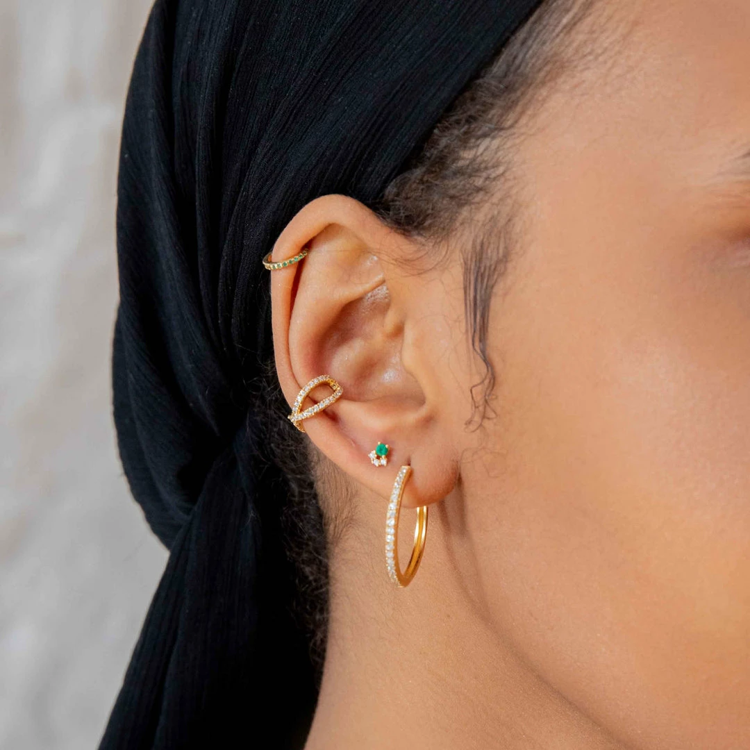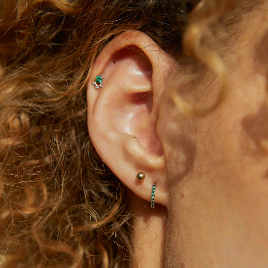 These Emerald Green & Crystal Barbell Earring in Gold are a timeless classic that will sit in your jewellery collection forever. With a deep emerald green cubic zirconia stone above dainty clear stones, this looks adorable stacked with huggies.