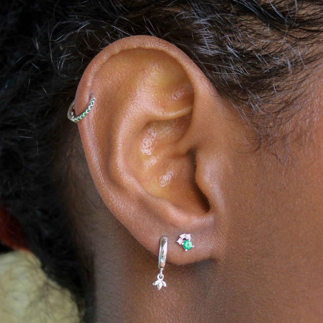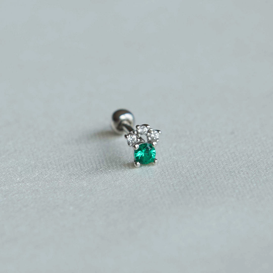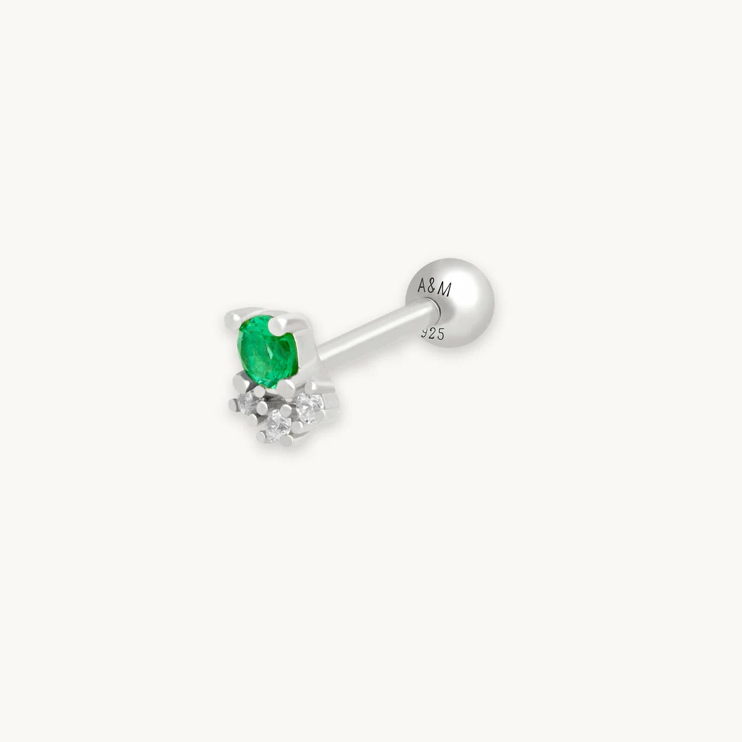 The Emerald Green & Crystal Barbell Earring in Silver is a timeless classic that will sit in your collection forever. With a deep green cubic zirconia stone above dainty clear stones, this looks adorable stacked with huggies.