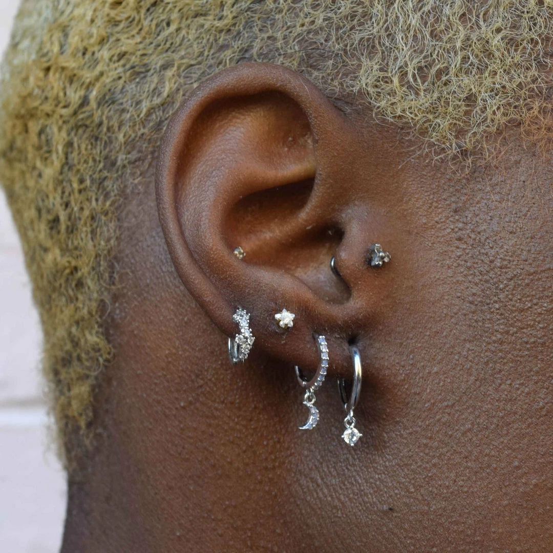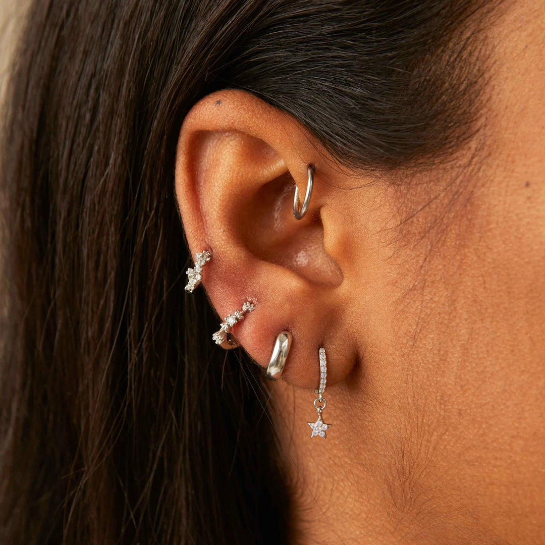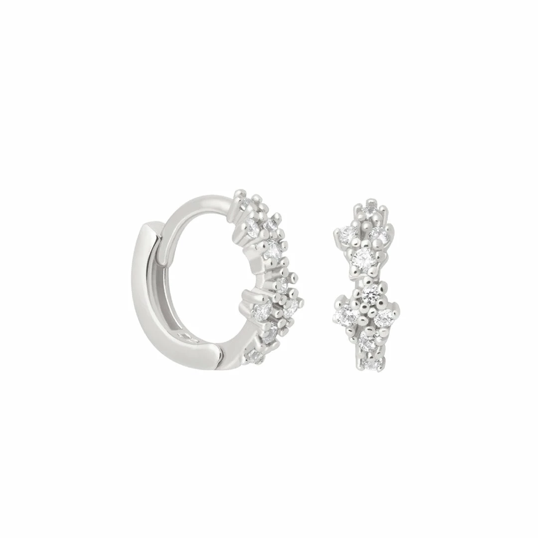 Twinkle from every angle with the Mystic Gem Huggies in Silver. They hug close to your lobe for that perfect halo effect. Made for every occasion and to brighten up any outfit. Made from Sterling Silver and Rhodium plated.Â