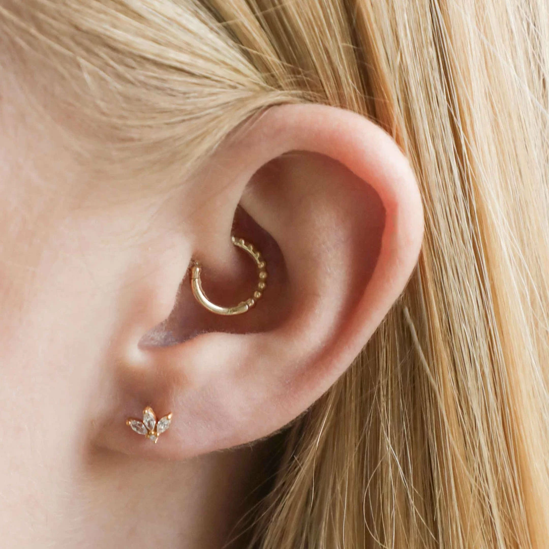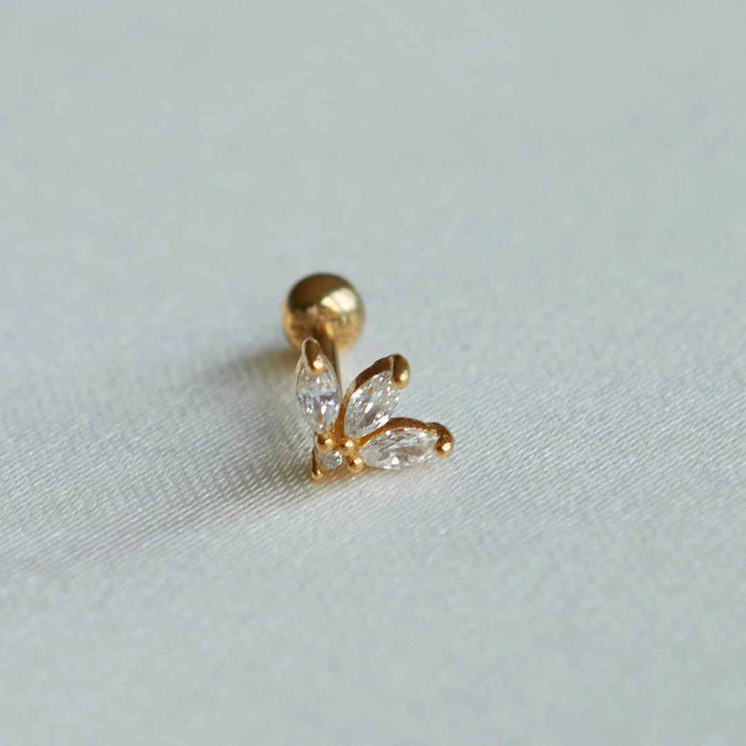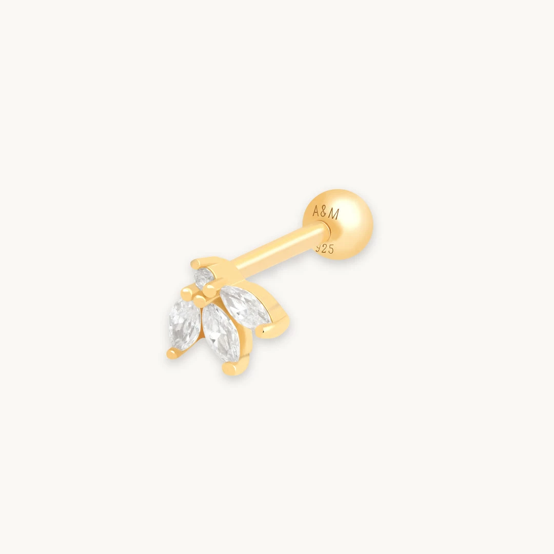 This navette crystal trio earring is the perfect crystal tragus/cartilage barbell earring. This unique piece may be tiny in size, but the three marquise-shaped sparkling cubic zirconias can make a statement and draw attention to your cute piercing.