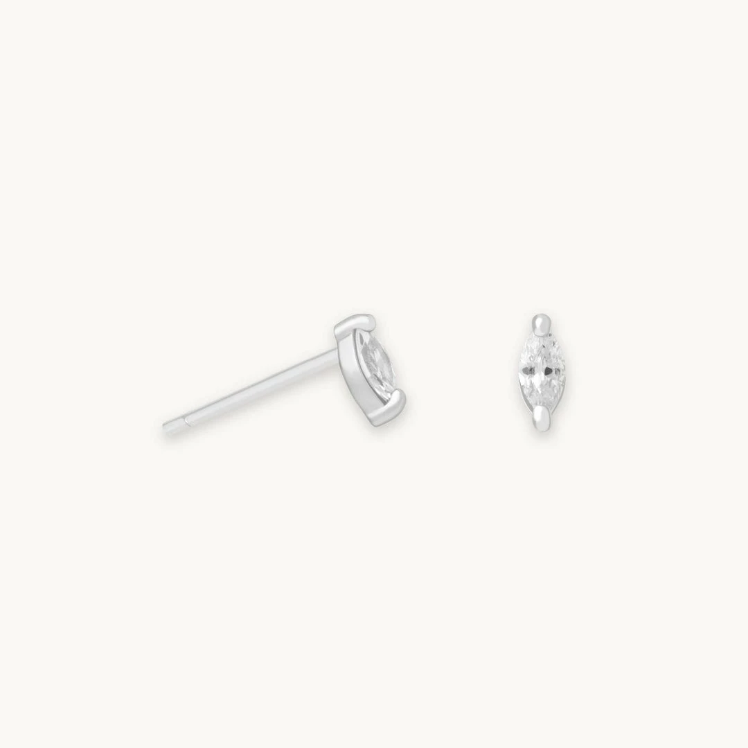 Our navette earrings in silver feature a super sparkly cubic zirconia stone that gives a sleek silhouette to your ear stack. Wear as crystal tragus jewellery or stack them with jewelled huggies & clickers. *Please note – Earrings are non returnable due to hygiene reasons.
