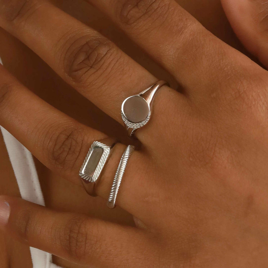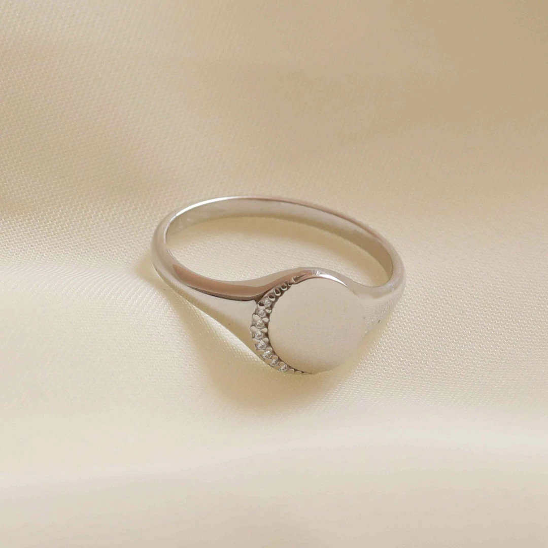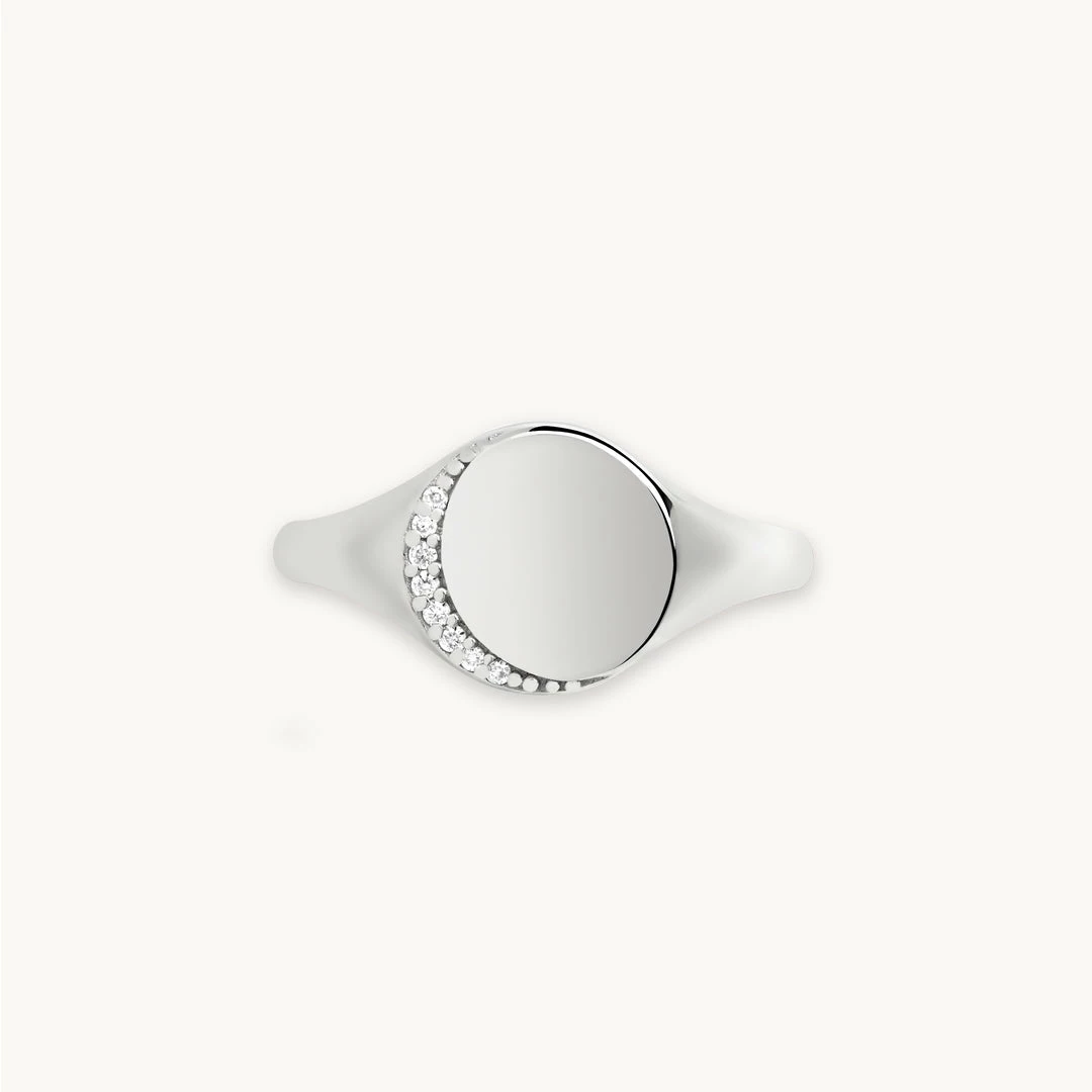 A timeless treasure ~ the Crystal Crescent Signet Ring in Silver is a piece to hold onto forever. In a classic signet style, this will never go out of style. It’s got a crystal crescent detail across the side to add a subtle A&M sparkle. Engrave it to make it yours, and remember special moments just by glancing at your hands. Wear on its own, or wear stacked with our other rings for a statement vibe.