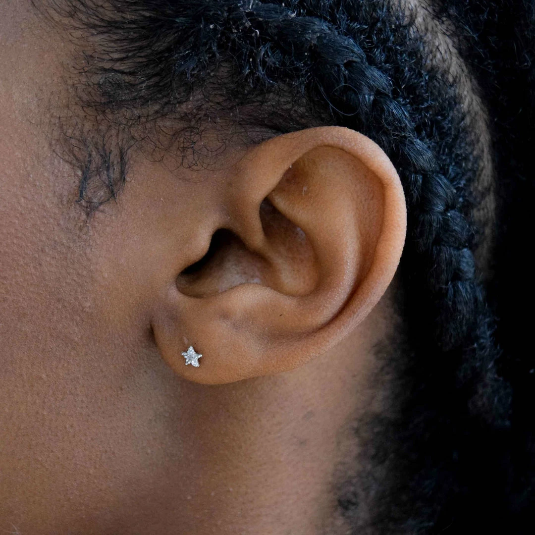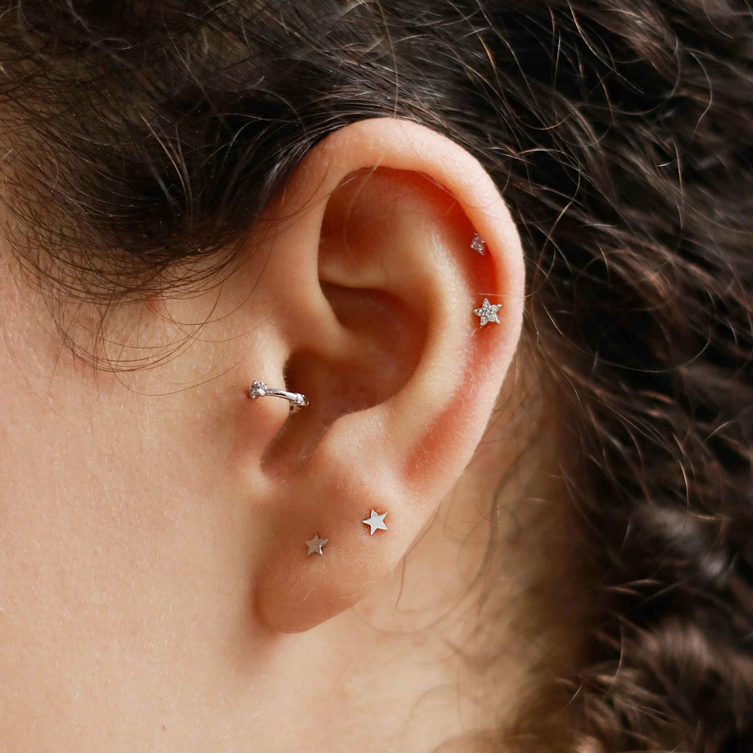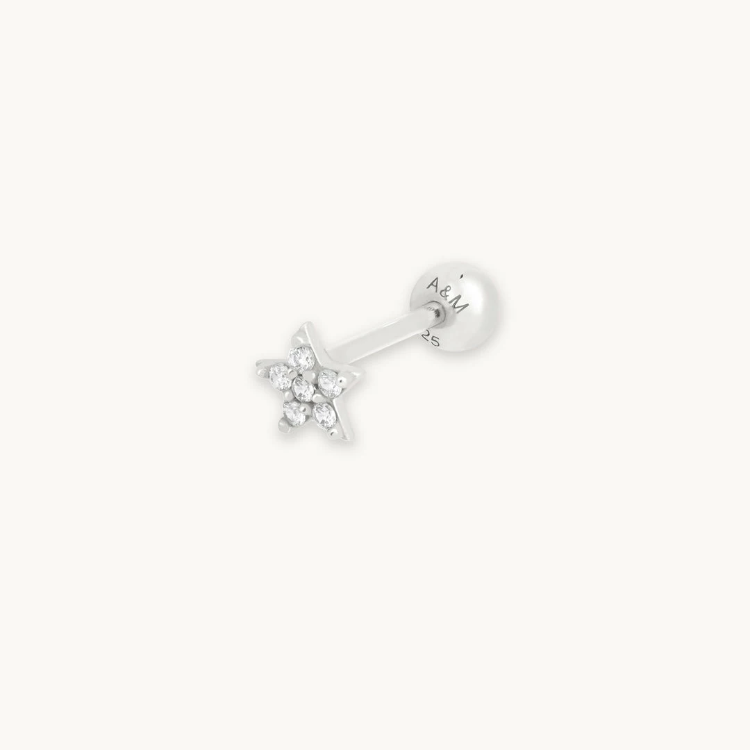 Starry starry day to night with the Jewelled Star Barbell in Silver. Made for those special occasions and everyday life. Shimmering cubic zirconias adorn this delicate star, perfect for any constellation piercing. Made from Sterling Silver and Rhodium plated.
