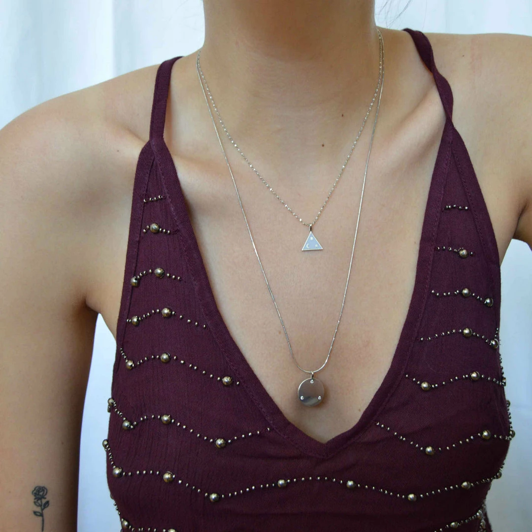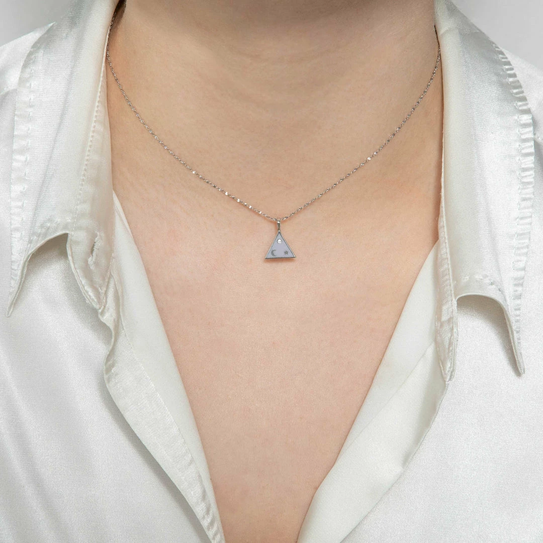 Go bigger and bolder with the Triangle & Enamel Necklace Charm in Silver. With a lilac enamel coating and celestial vibes, this charm is designed to stand out amongst your necklace stack. Simply add to any of our dainty necklace chains, and you’re good to go!Â