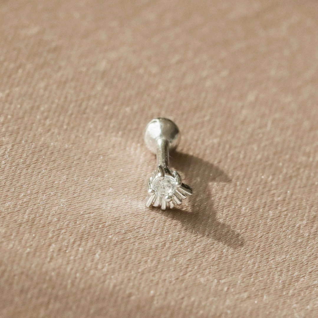 Beams of light to give us all hope ~ the Sunbeam Crystal Barbell in Silver is a ray of sunshine in earring form. With a teeny cubic zirconia inlay, this sparkling barbell has a sunbeam design underneath, so your ear stack can shine like the sun. Wear this with our Radiant Textured Huggies and Baguette Crystal Ear Cuff for the full Aurora Collection glow.